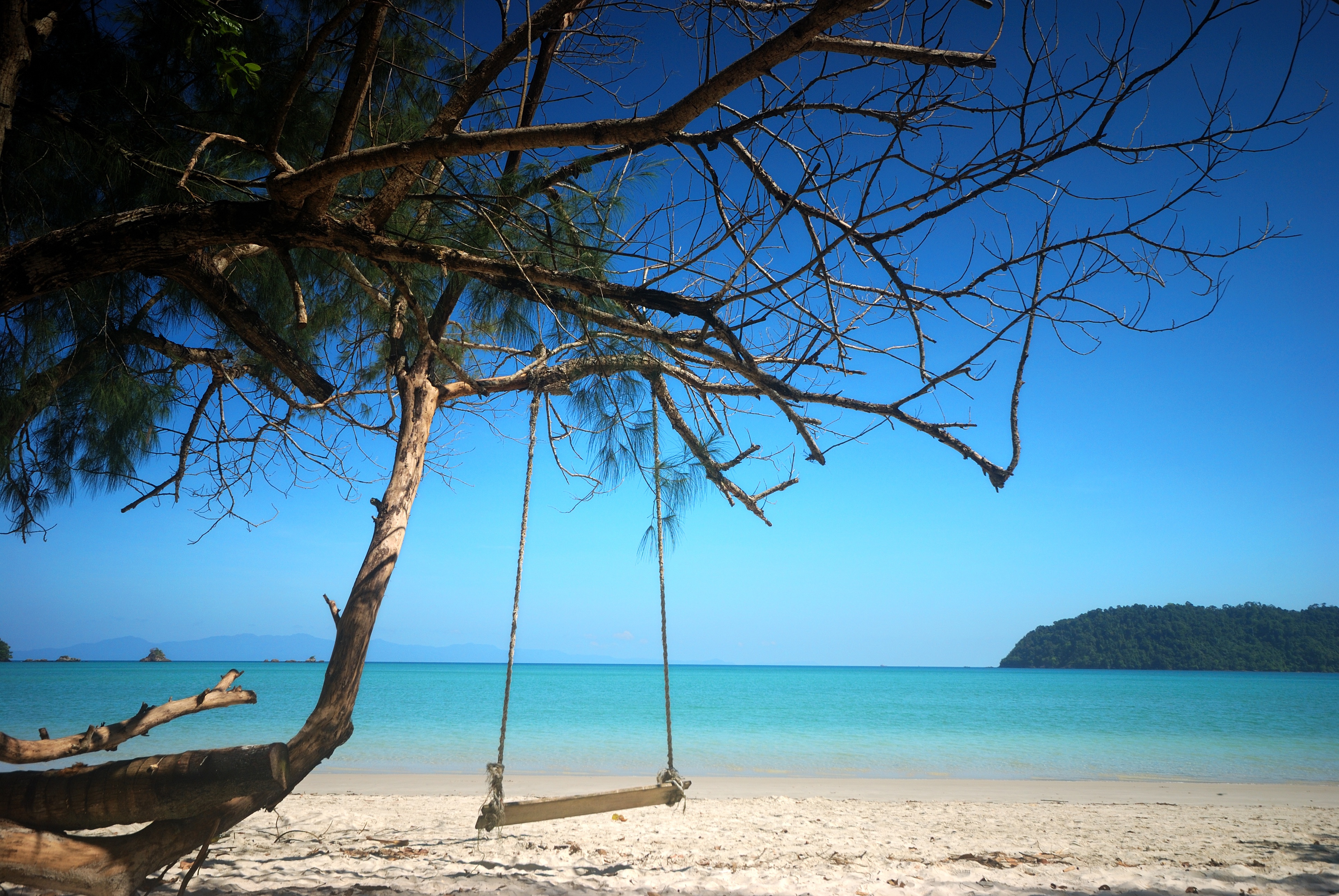 Description: A tree branch hanging over a beach with a swing in the sand and a body of water in the background.