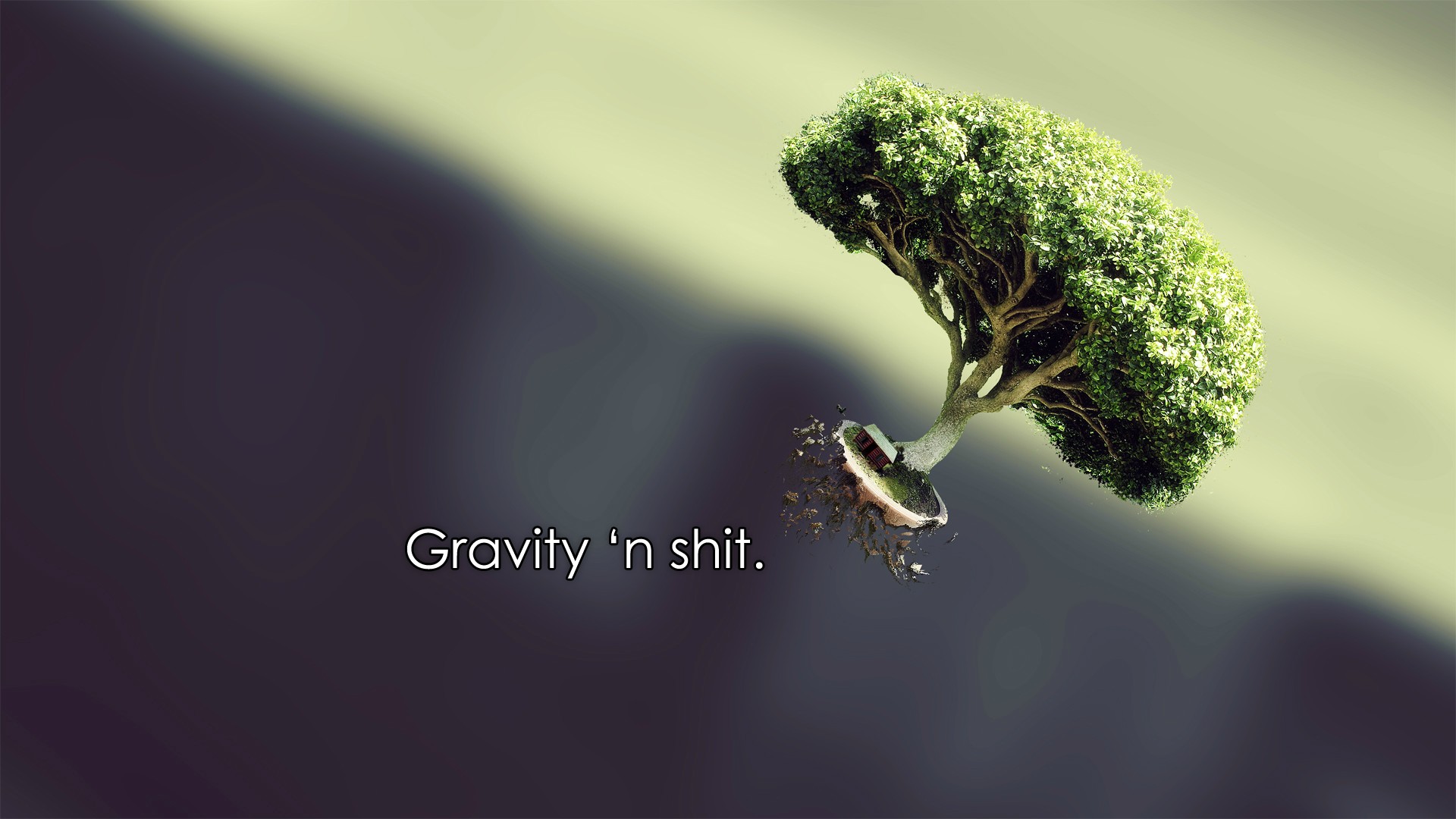 Description: A tree with a bird flying over it and a quote above it that says gravity in shit on a black background.