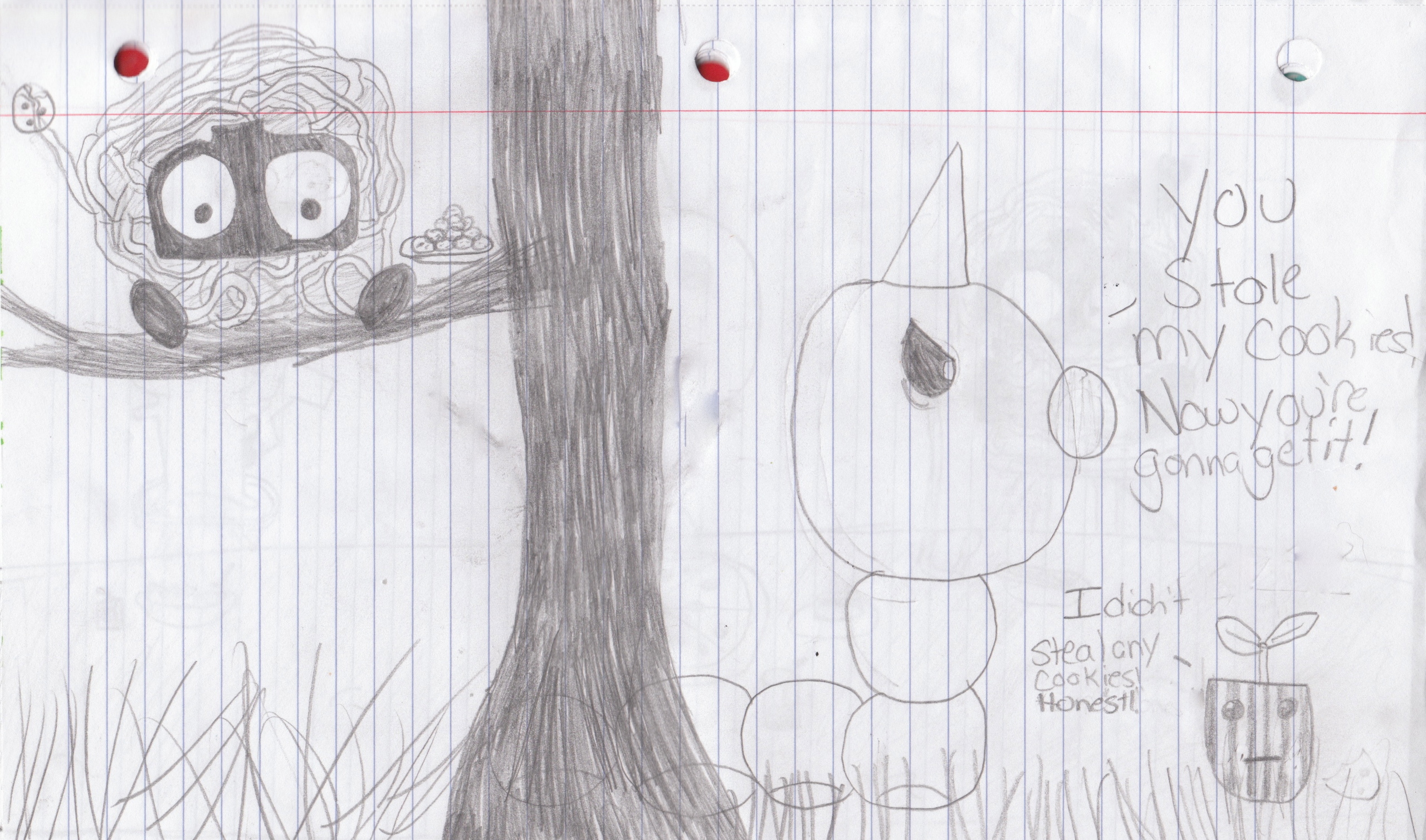 Description: A drawing of a tree with a bird on it and a pig on the tree branch with a bird on it.