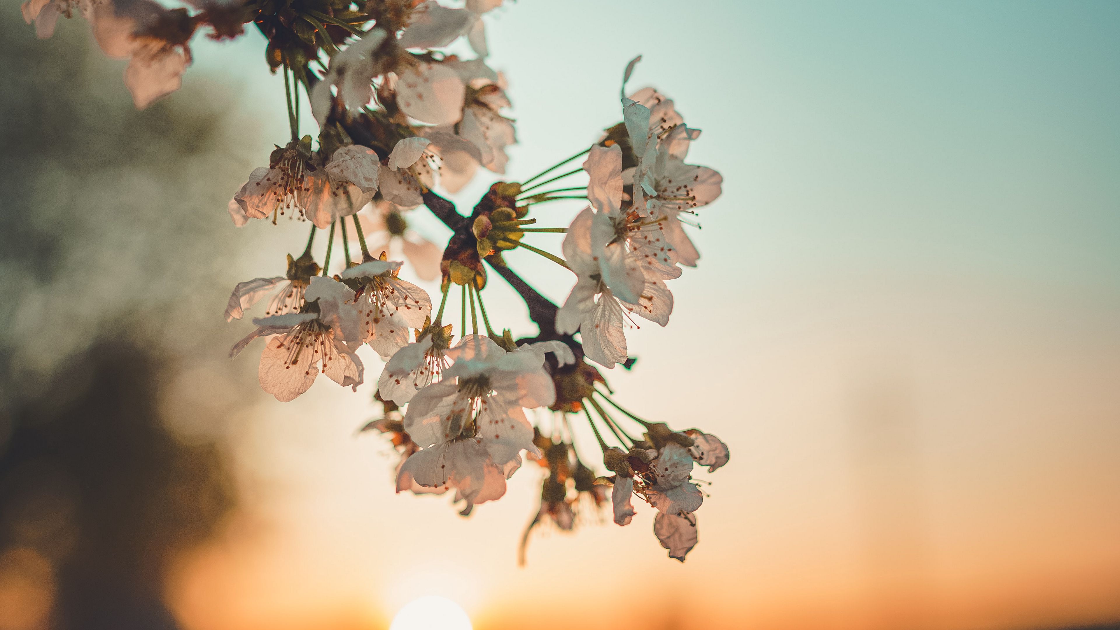 Description: A branch of a tree with white flowers in the sun setting behind it.