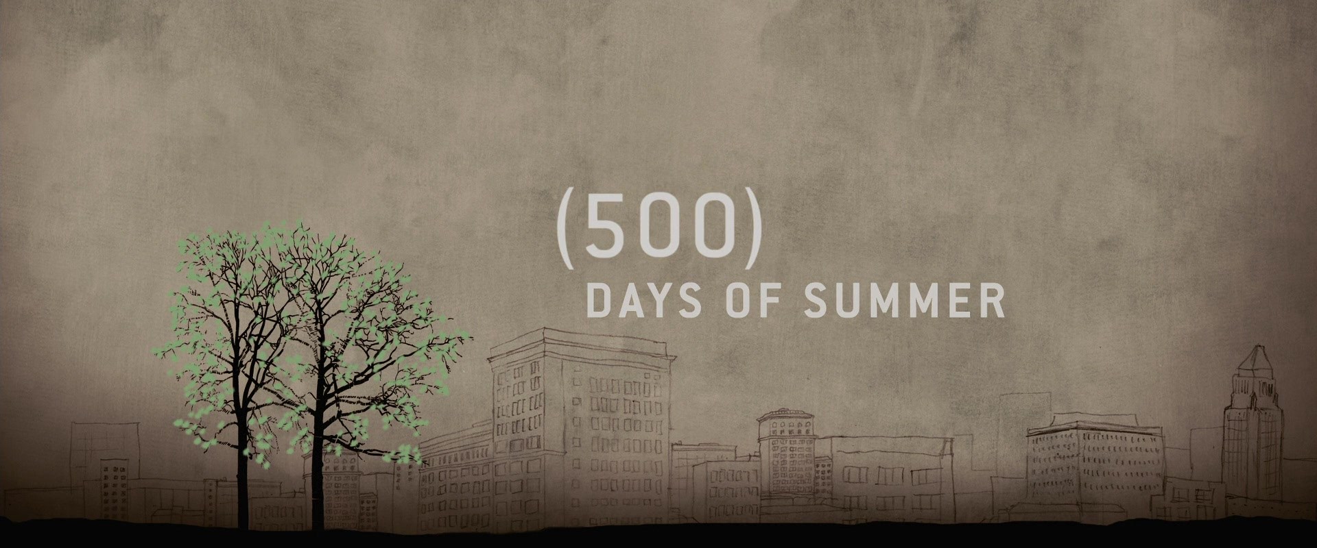 Description: A picture of a tree with a city in the background and a sign that says 500 days of summer.