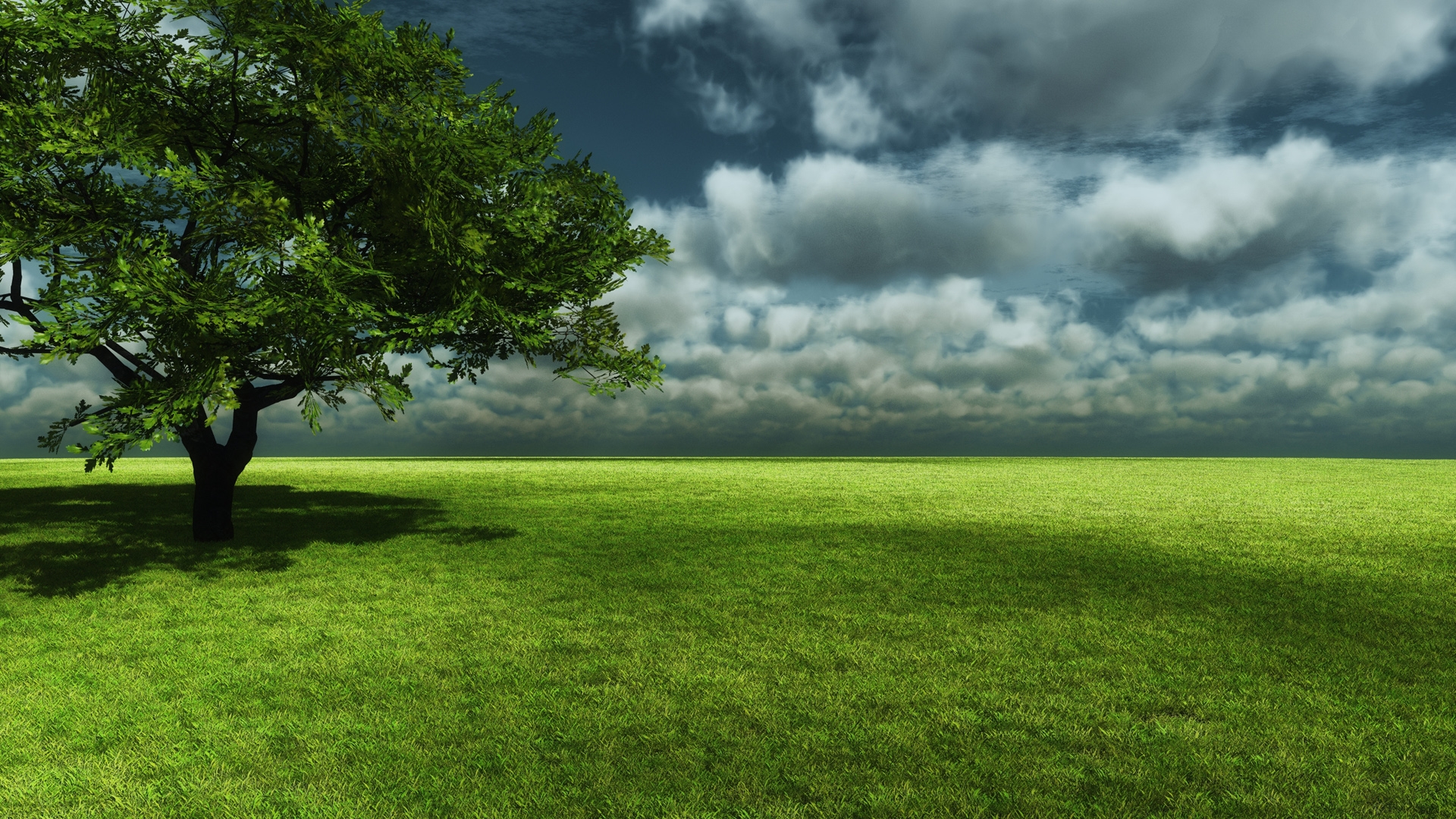 Description: A tree in a field with a cloudy sky in the background and a green field with grass and trees.