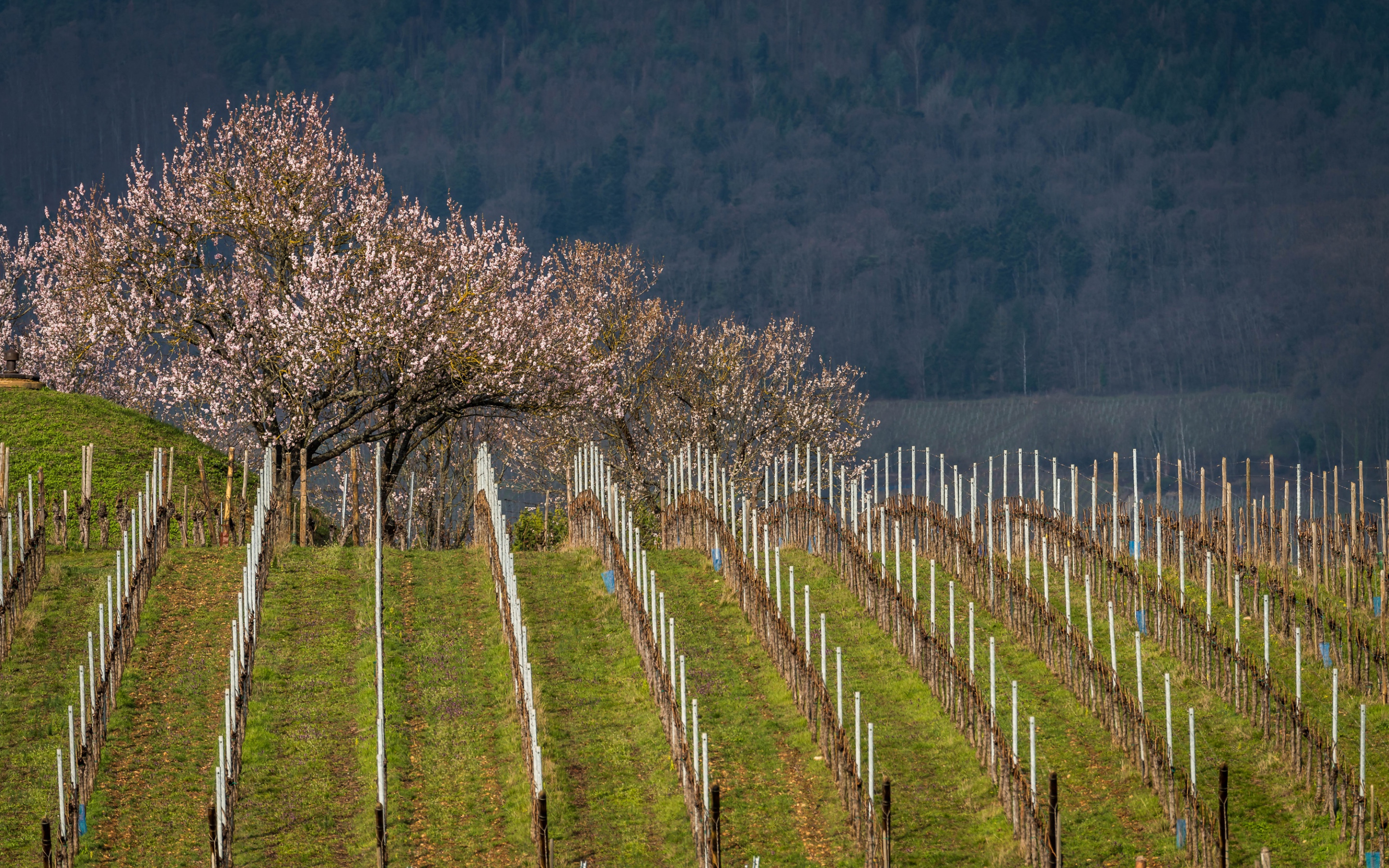 Description: A tree in a field with a fence and a hill in the background with trees in bloom and a few bushes in the foreground.