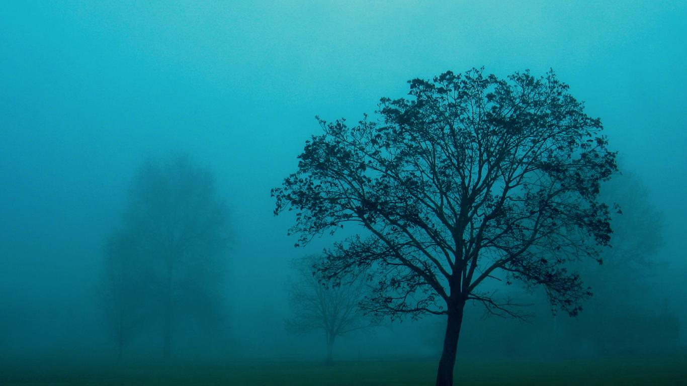 Description: A tree in a field with fog in the background and a sun shining through the trees in the distance.