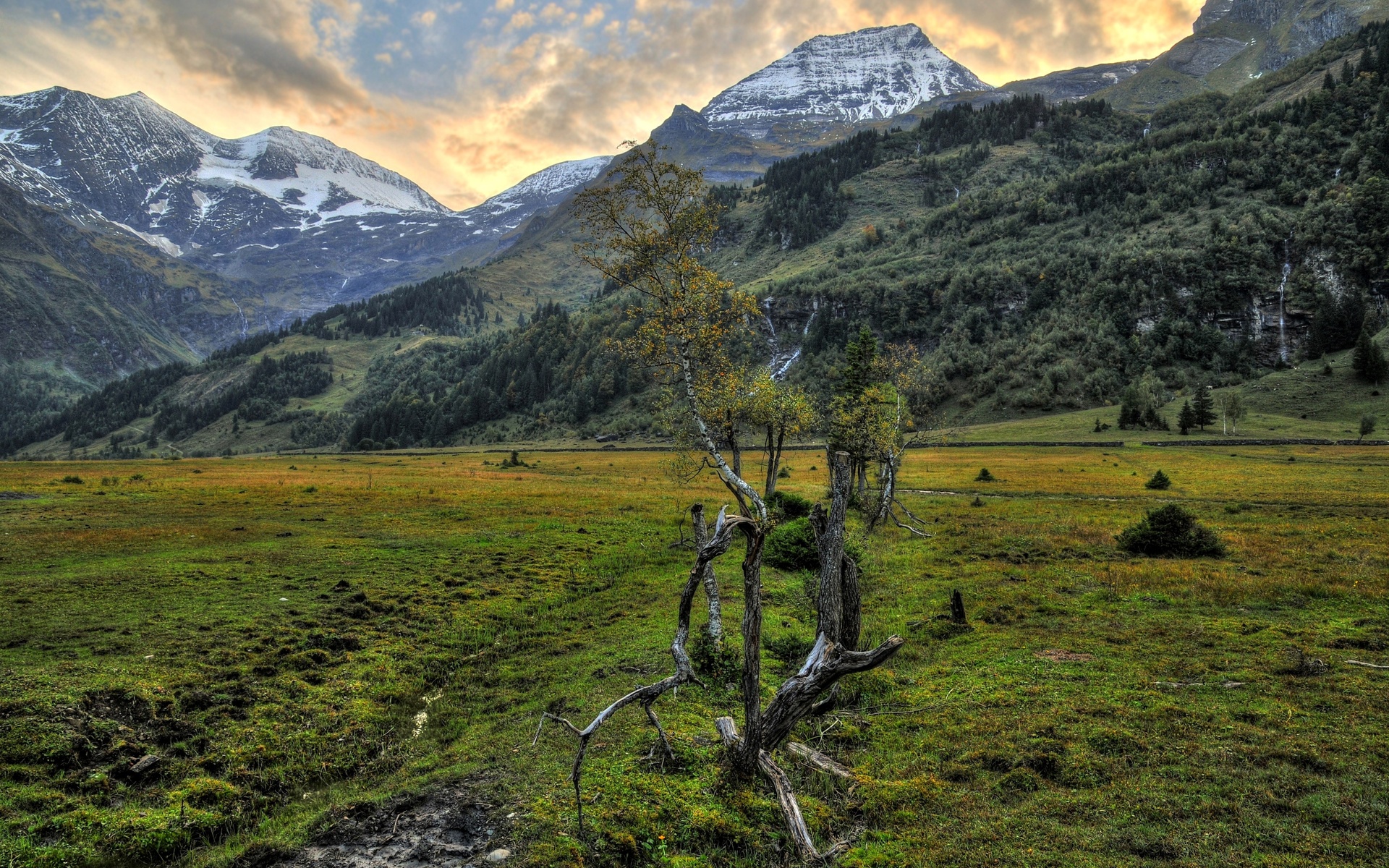 Description: A tree in a field with mountains in the background and a cloudy sky above it with a few clouds.