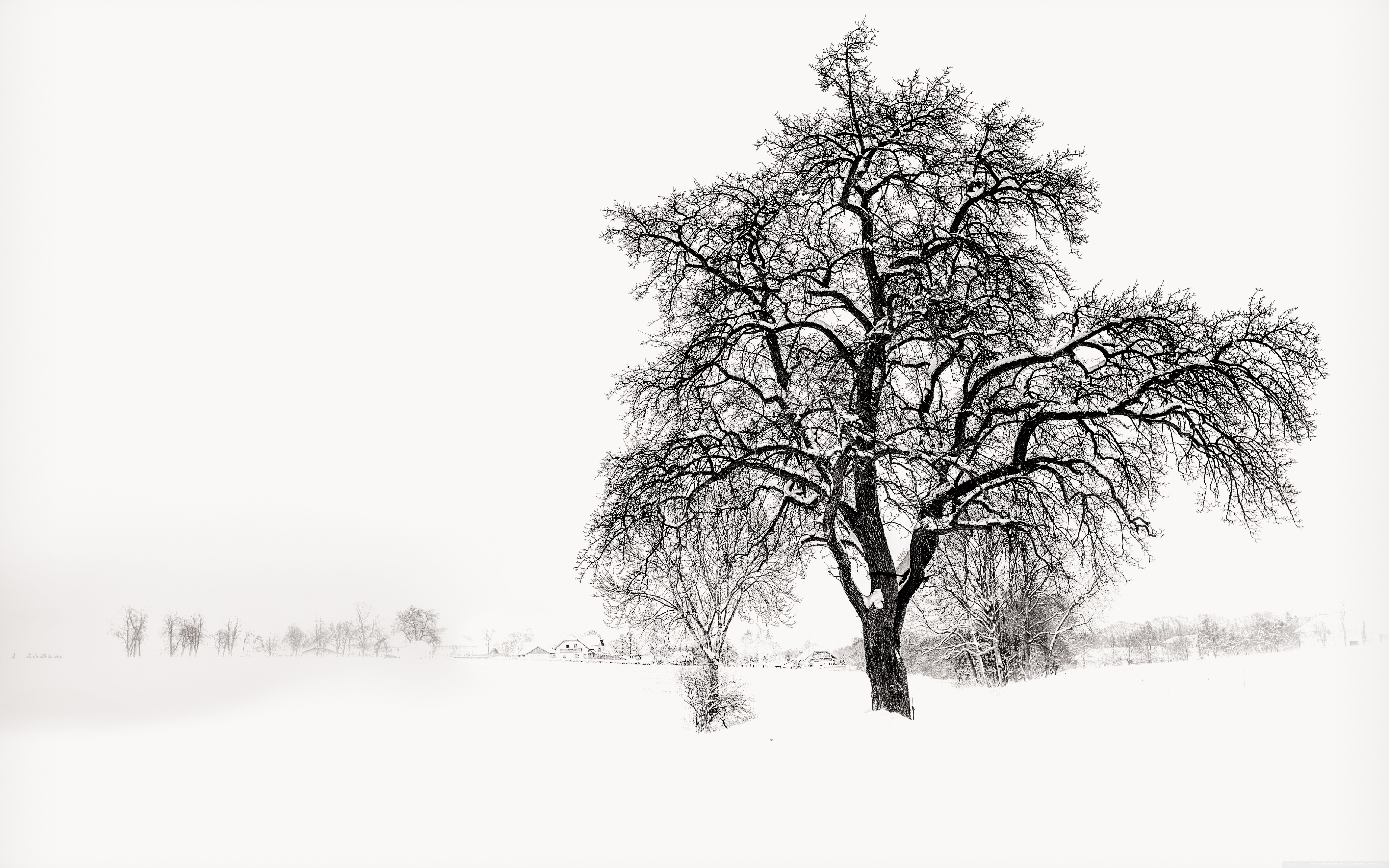 Description: A tree in a field covered in snow with a sky background and a few clouds in the distance with a few trees in the foreground.