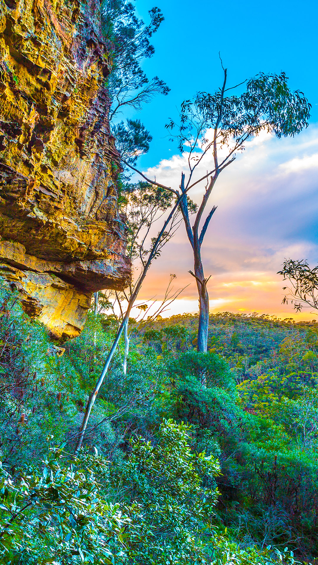 Description: A tree in the middle of a forest with a cliff in the background at sunset or dawn with a colorful sky.
