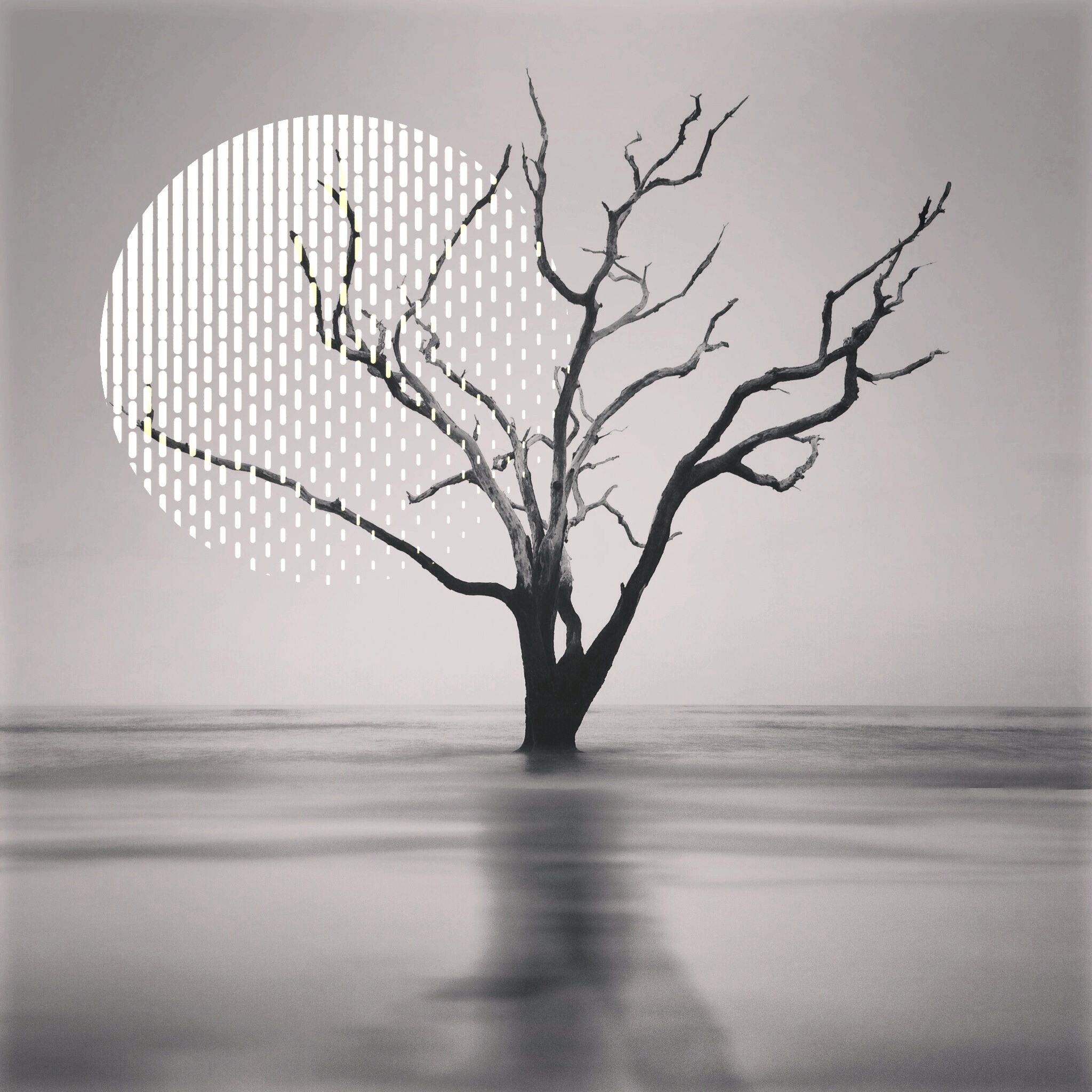 Description: A tree with a half circle in the middle of it and a half moon in the background with a half circle in the middle.