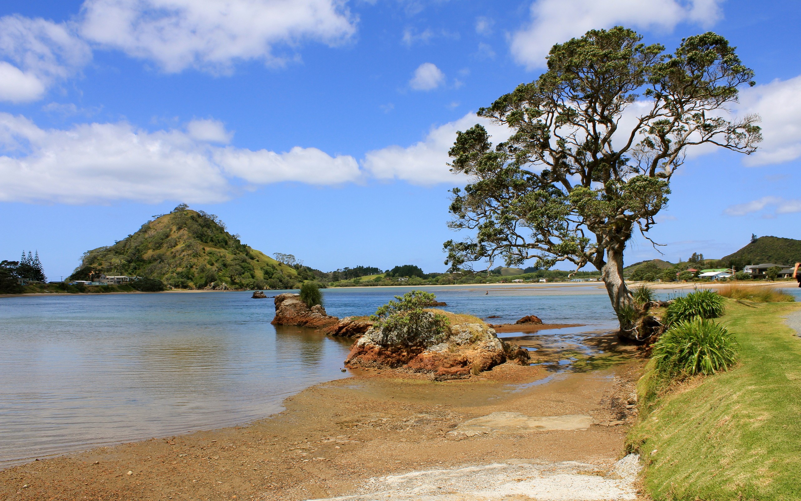 Description: A tree is standing in the middle of a lake with a mountain in the background and a blue sky with clouds.