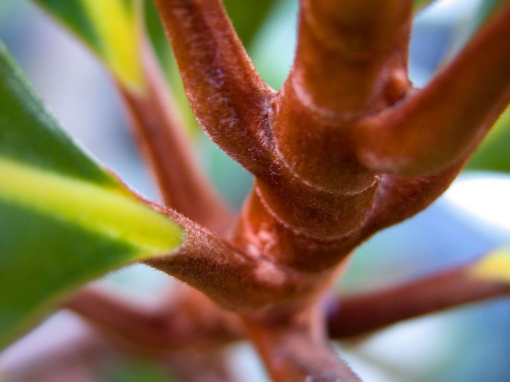 Description: A close up of a tree branch with green leaves and a blurry background of blue sky in the background.