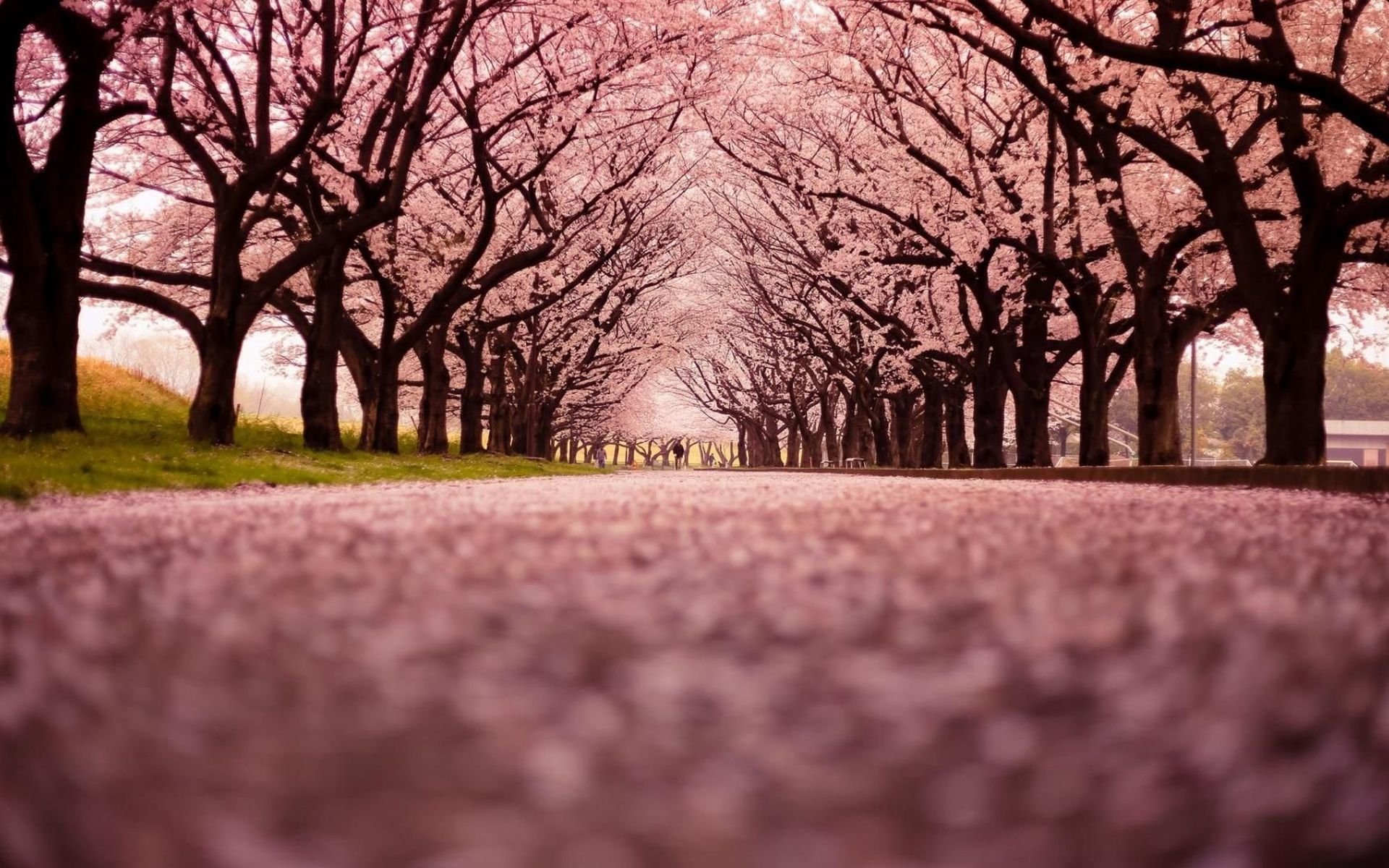 Description: A tree lined road with a lot of pink flowers on it's trees and grass on both sides.