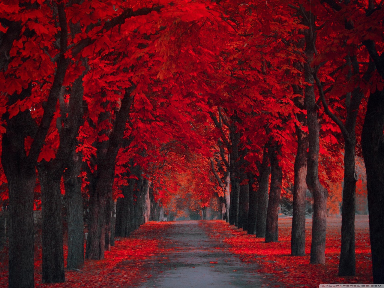 Description: A painting of a tree lined road with red leaves on the trees and a path leading to the trees.