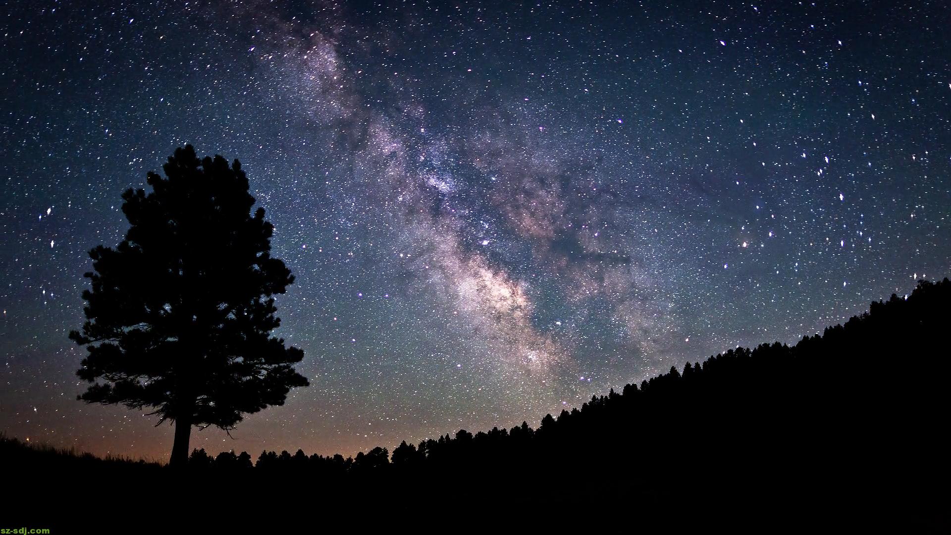 Description: A tree and a night sky with stars and a milky background with a silhouette of a tree and a hill.