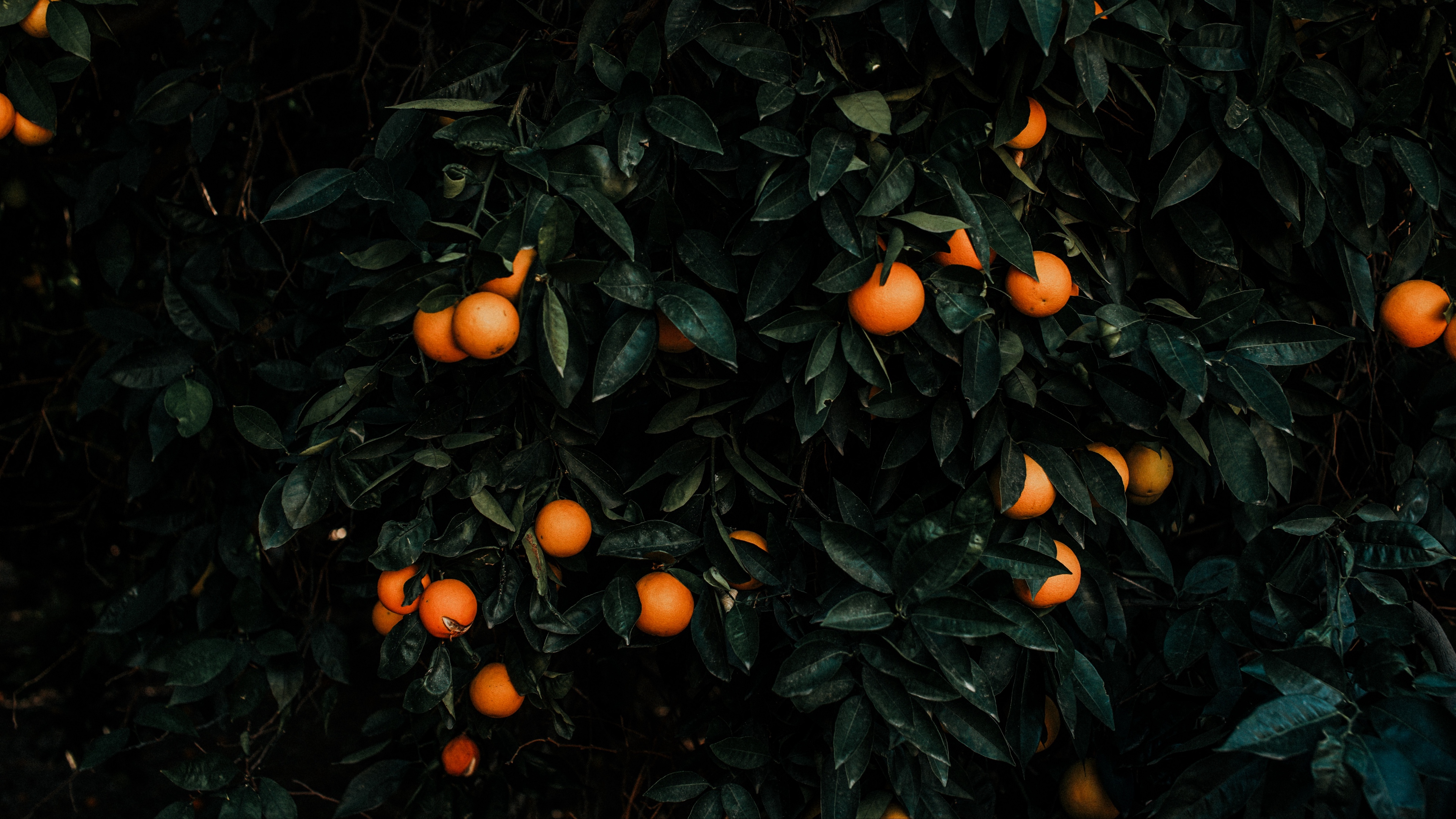 Description: A tree filled with lots of oranges on top of leaves and branches with green leaves on the branches.