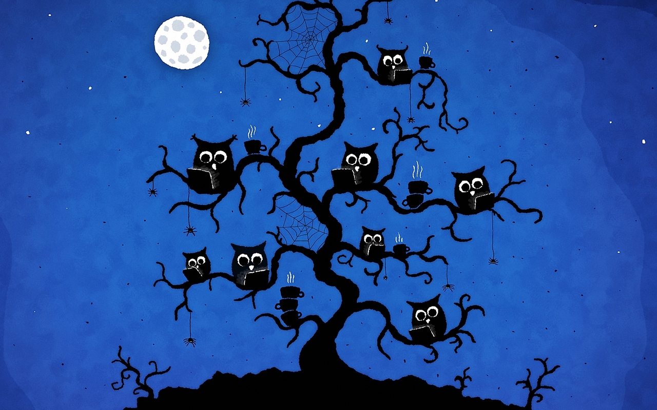 Description: A tree with four owls sitting on it's branches with a full moon in the background and a blue sky with stars.