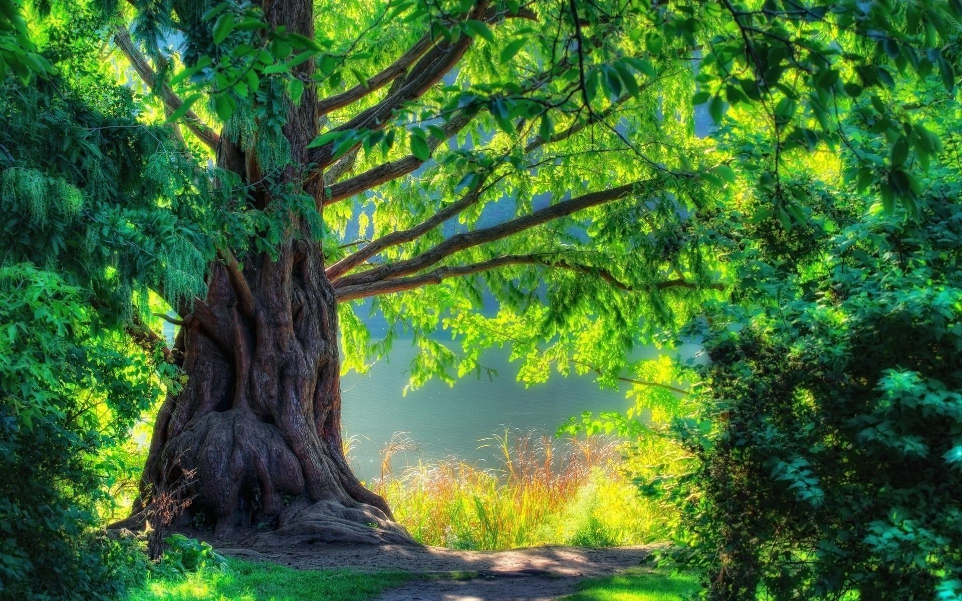 Description: A tree with a path leading to it in the middle of a forest with a path leading to it.
