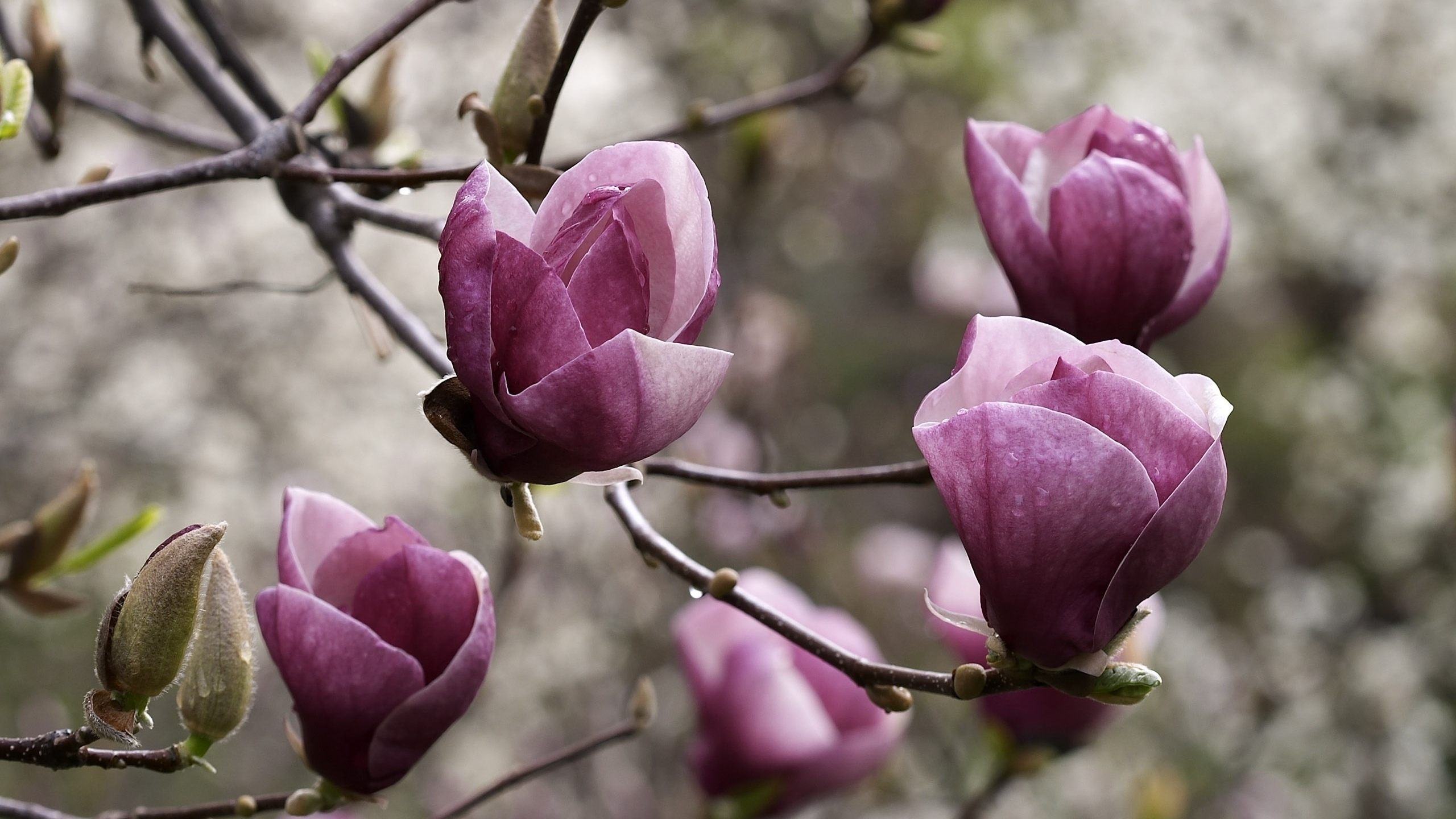 Description: A tree with purple flowers in the middle of it's branches and leaves on the branches.