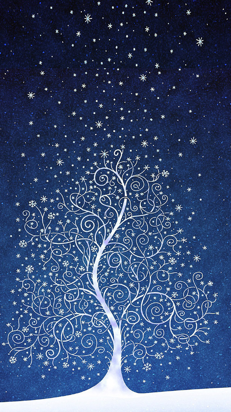 Description: A painting of a tree with snow falling on it and stars in the sky above it.