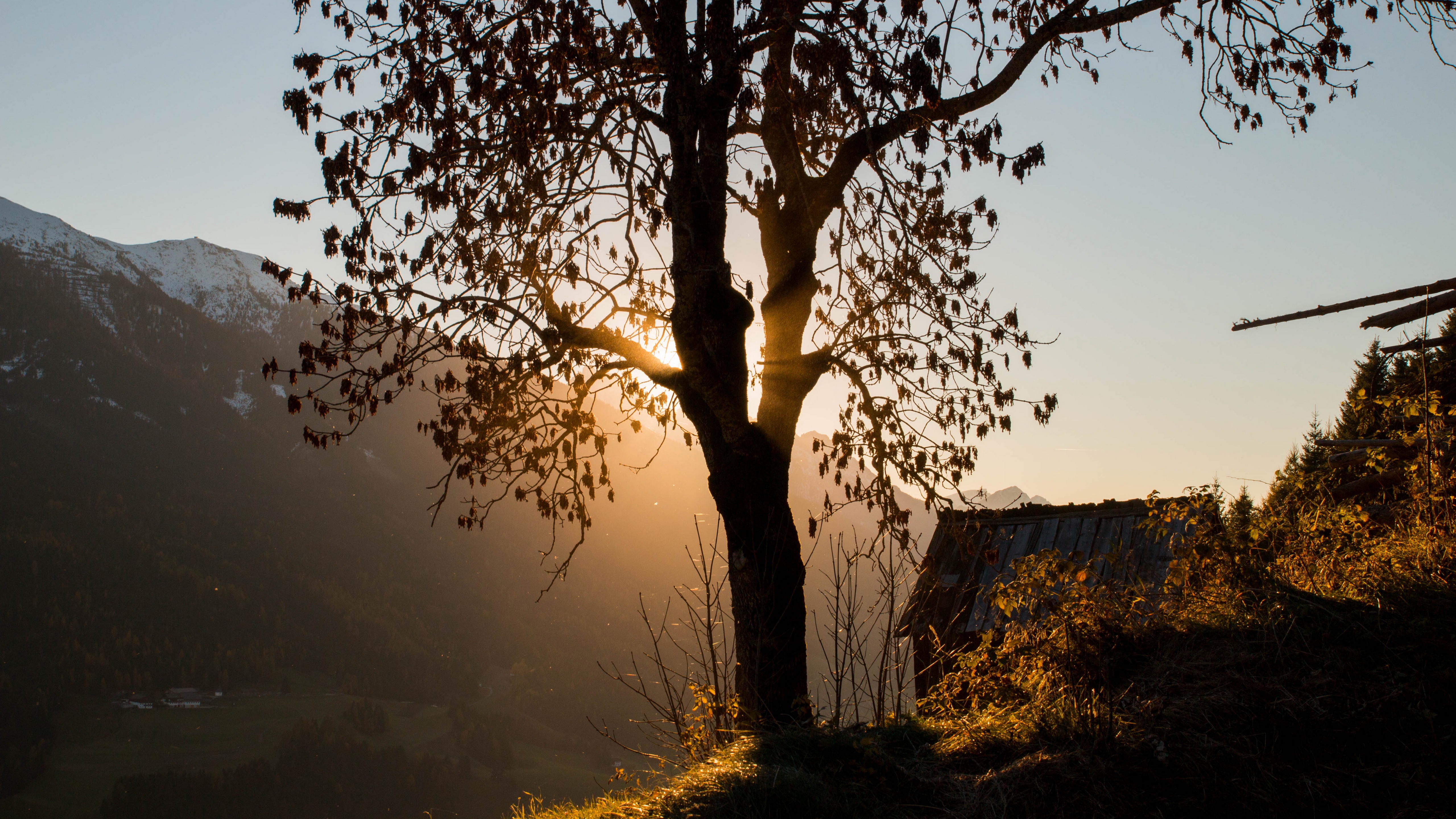 Description: A tree with the sun shining through the branches in the background of a mountain range with a house in the foreground.