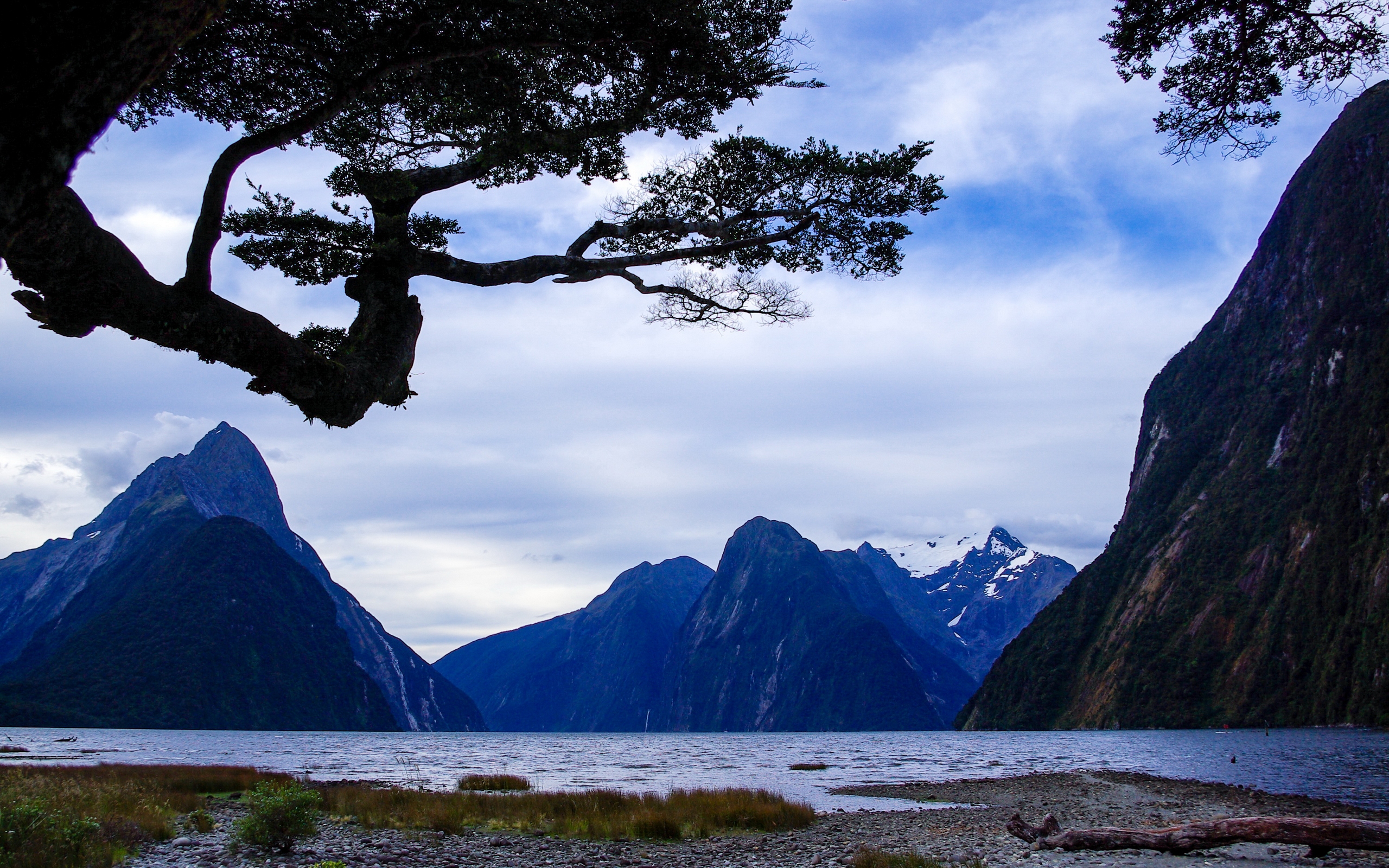 Description: A tree is hanging over a body of water with mountains in the background and a cloudy sky above it.