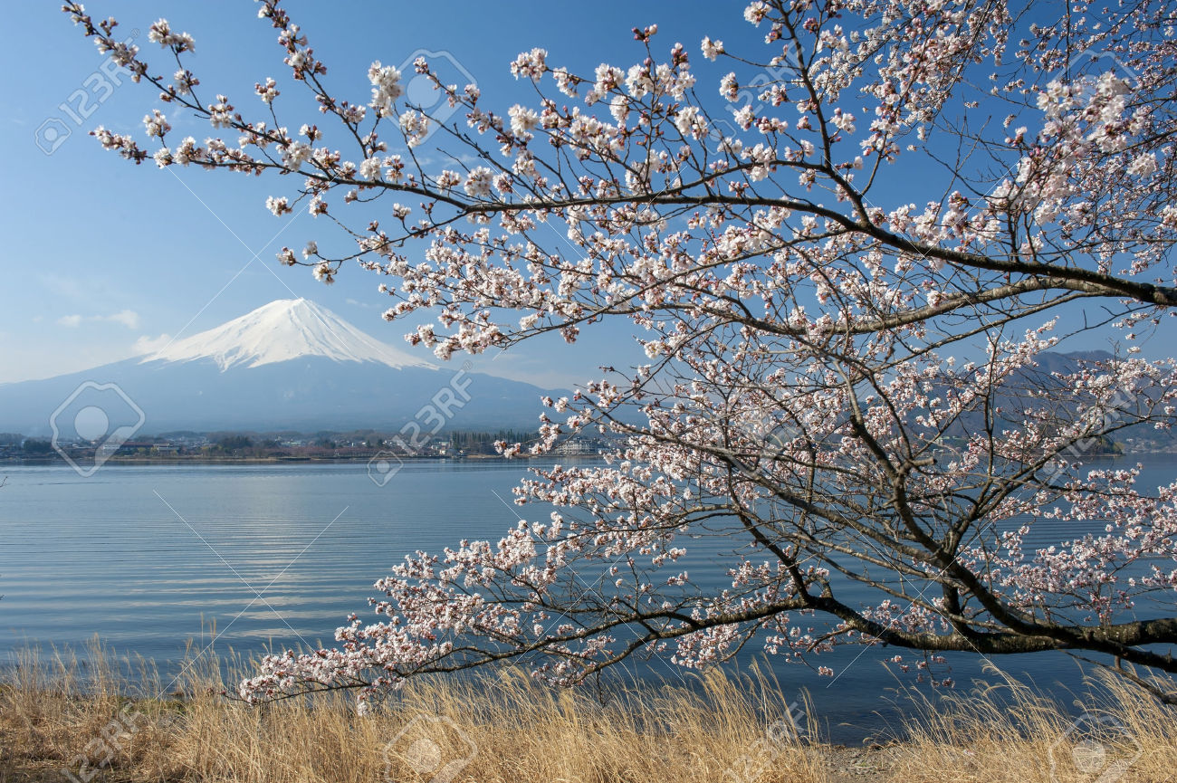 Description: A tree with white flowers near a body of water with a mountain in the background with a blue sky.