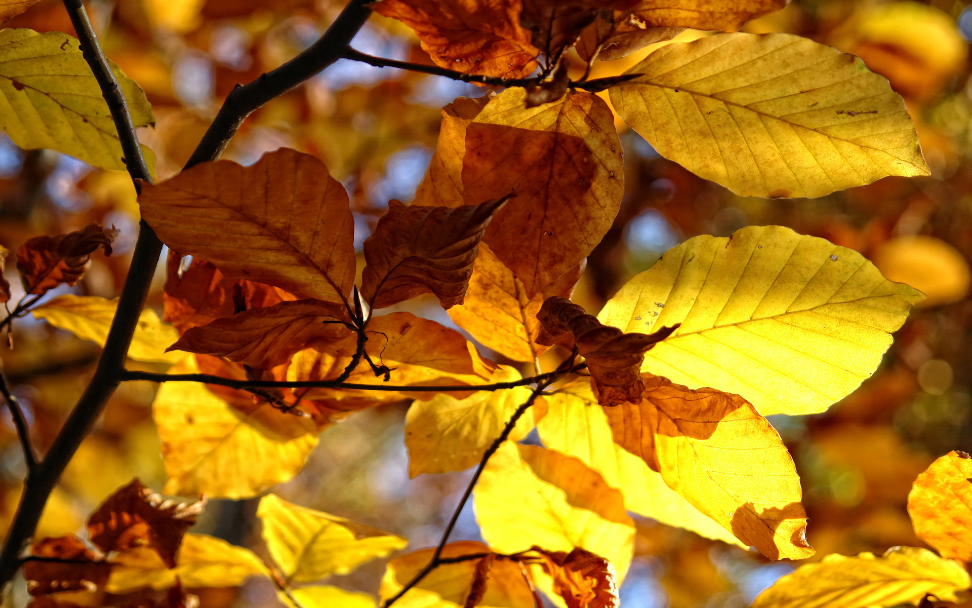 Description: A tree with yellow leaves in the fall season with a blue sky in the background and a few yellow leaves on the branches.