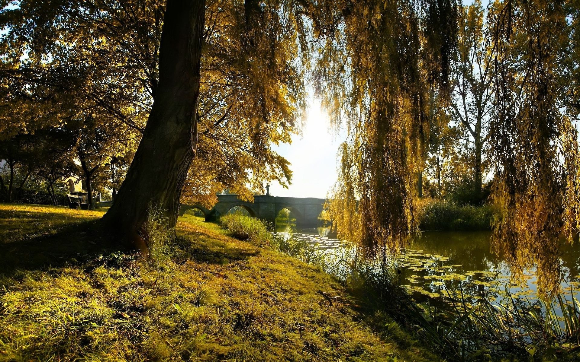 Description: A tree with yellow leaves near a body of water with a house in the background and a bridge in the distance.