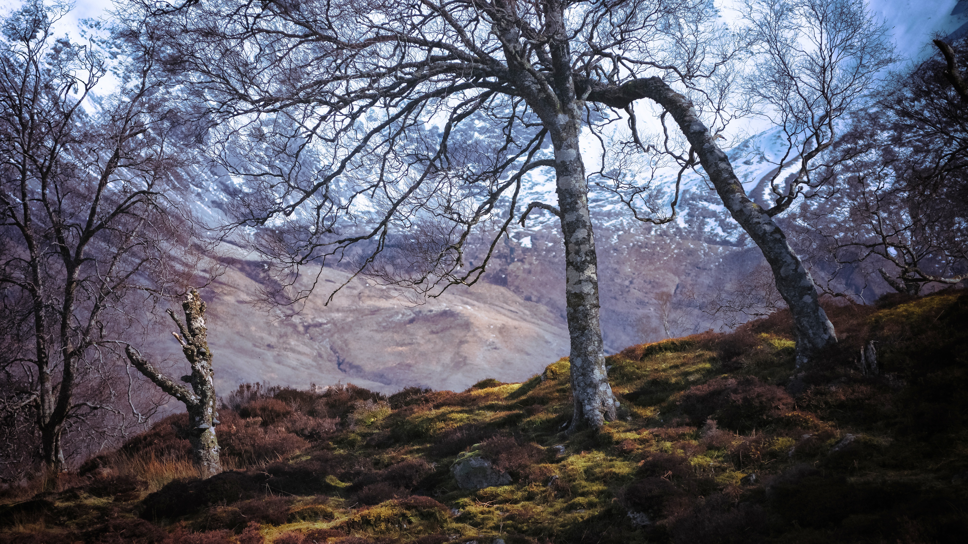 Description: A couple of trees that are on a hill side with grass and rocks in the foreground and a mountain in the background.
