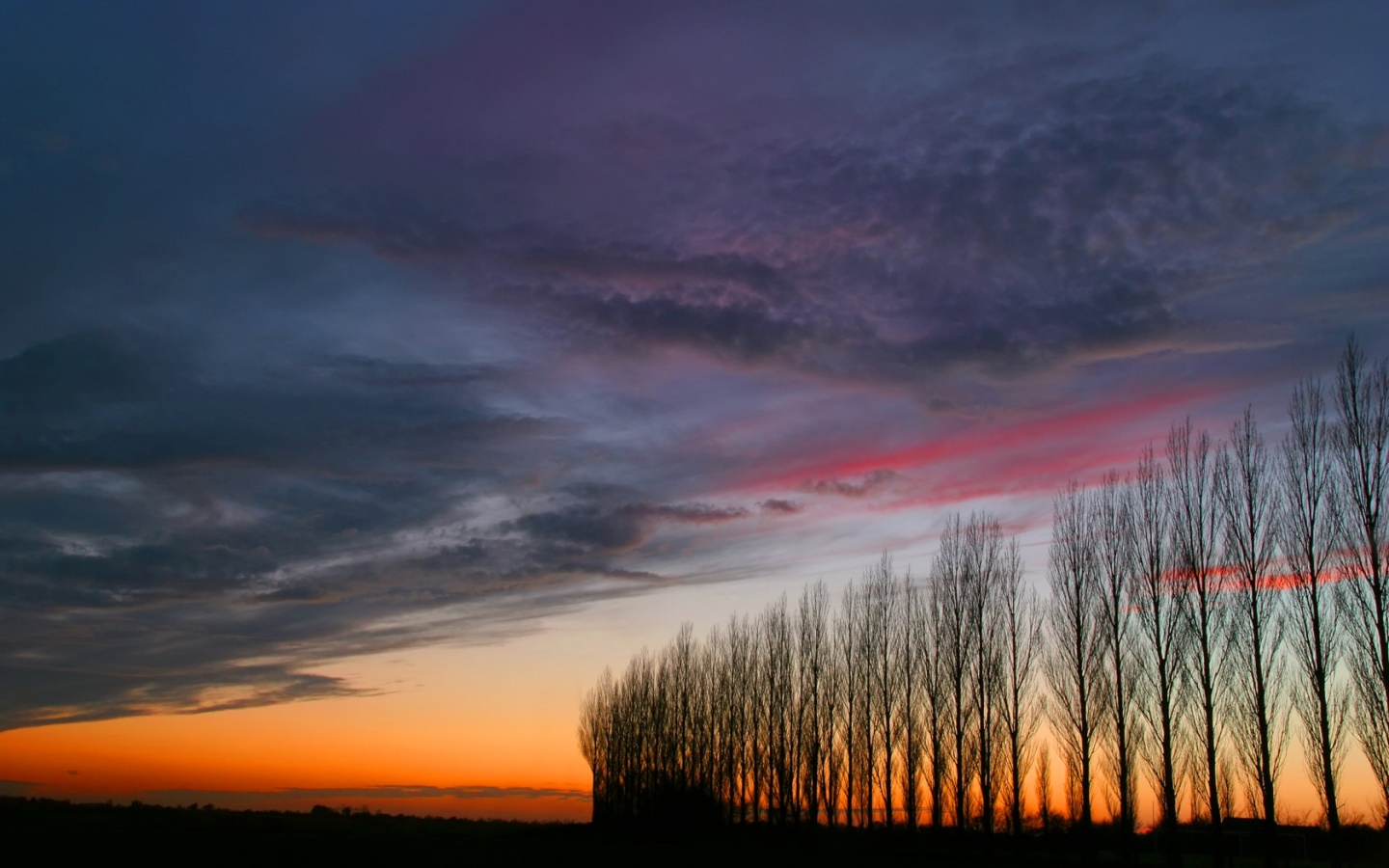 Description: A row of trees with a sunset in the background and clouds in the sky above them.