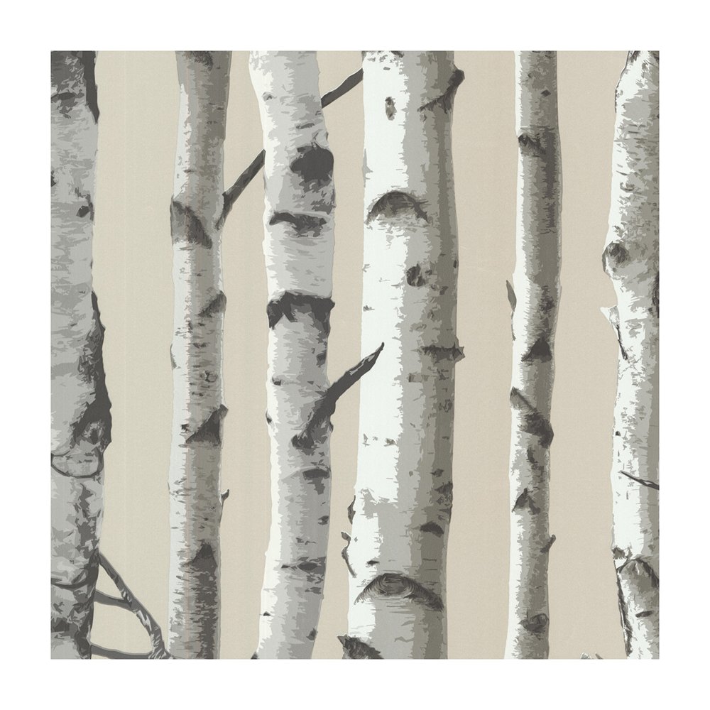 Description: A group of trees with white trunks on a beige background with a white border around the trunks and a beige wall.