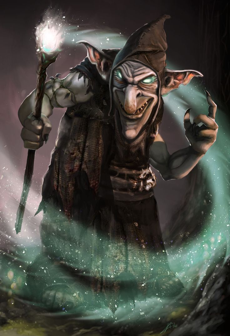 Description: A painting of a troll holding a light saber in his hand and a glowing orb in the background with a dark background.