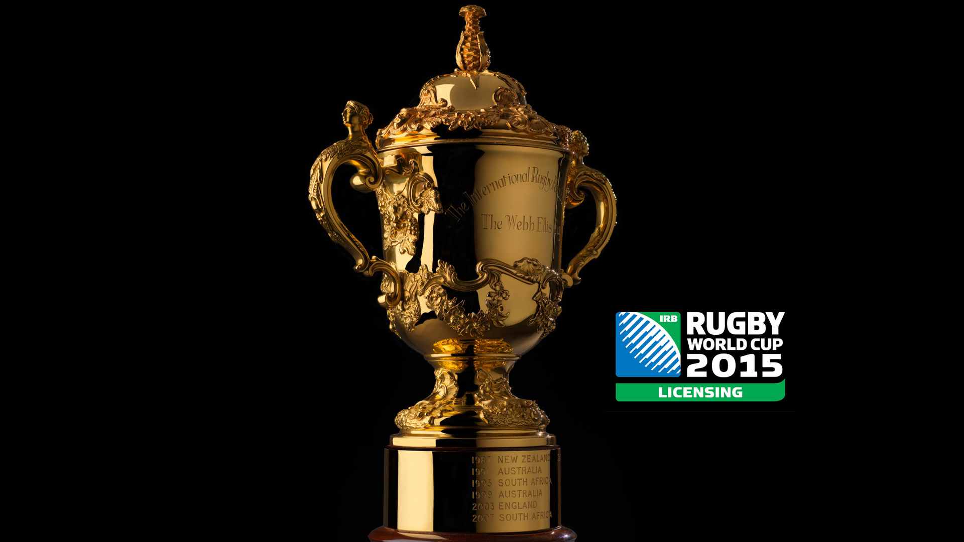 Description: A trophy with a black background and a rugby world cup on it's pedestals with a gold trophy on top.