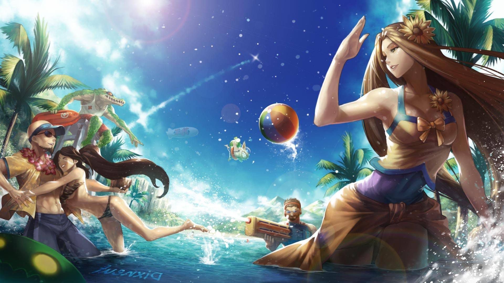 Description: A group of people in a tropical setting with a ball in the air and a man on a surfboard.