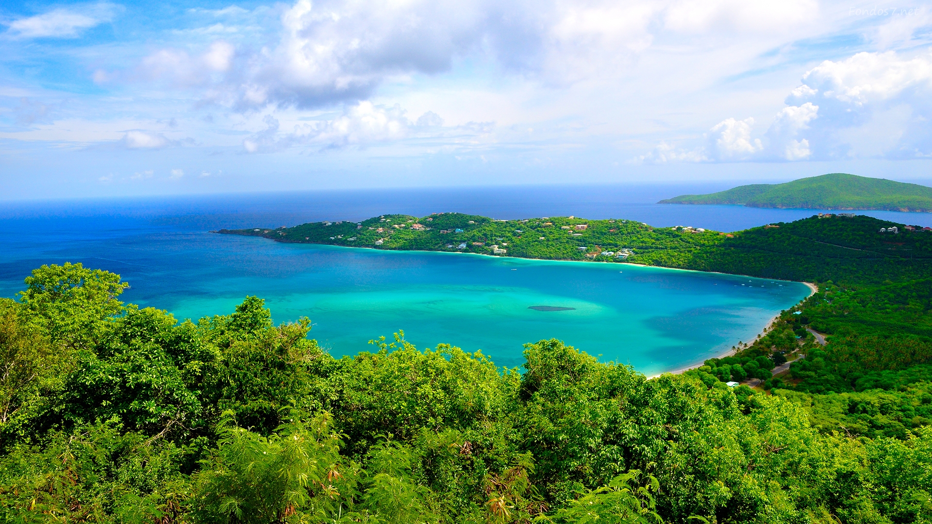 Description: A view of a tropical island with a lagoon and a beach in the distance with a blue sky and clouds.