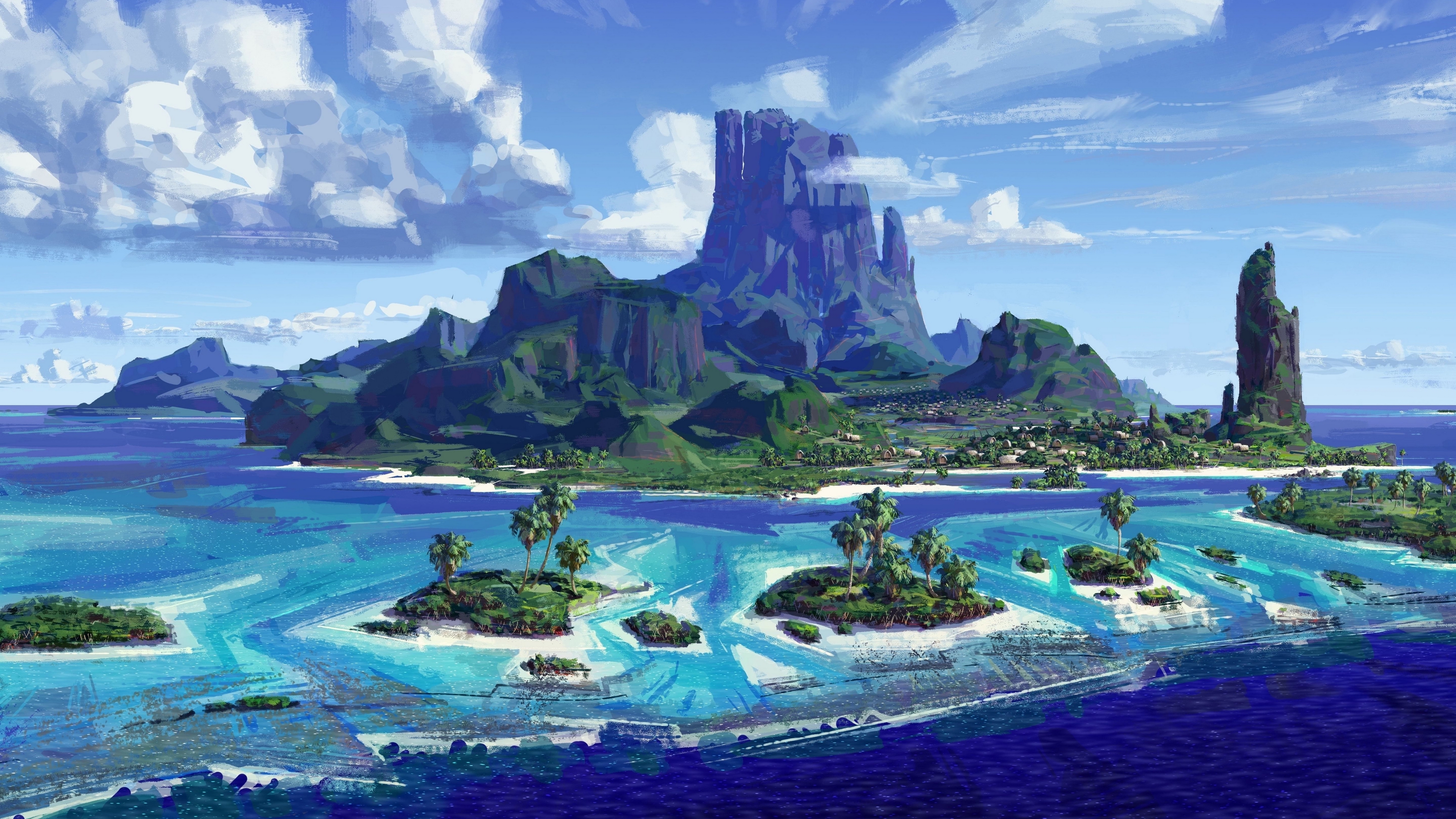 Description: A painting of a tropical island with a mountain in the background and a blue sky with clouds above it.