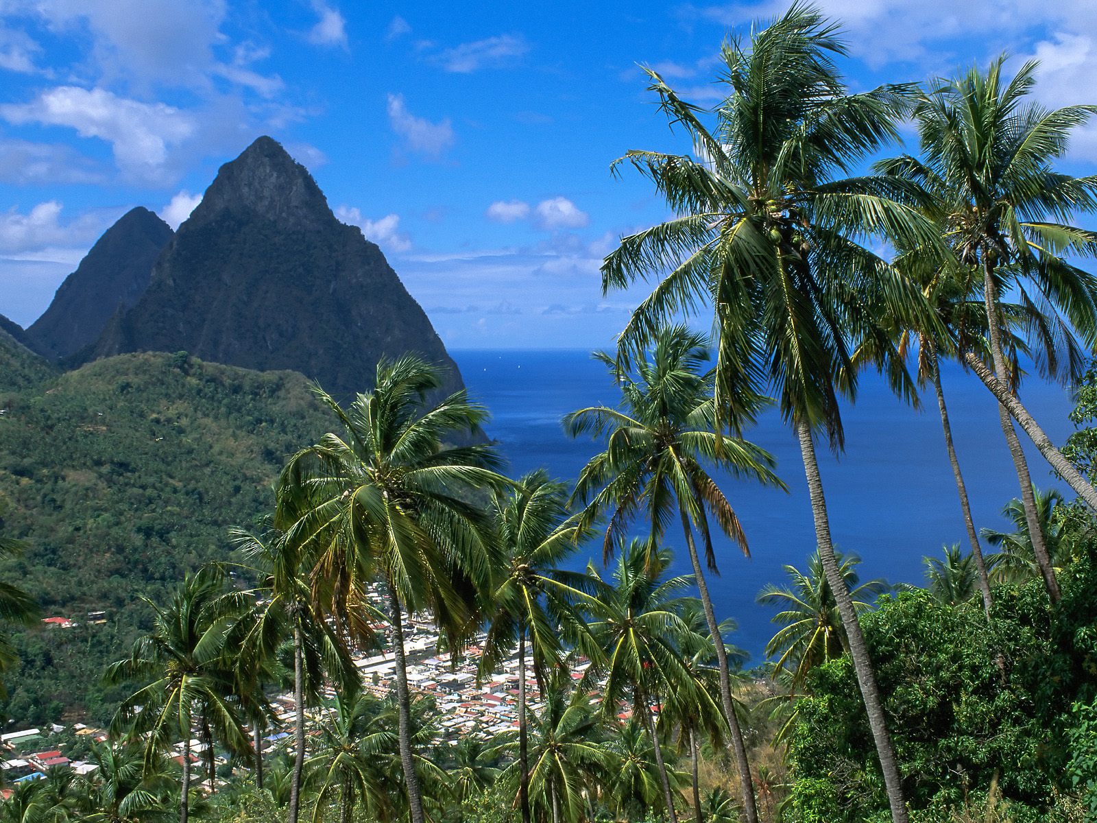 Description: A view of a tropical island with palm trees and a mountain in the background with a blue sky and clouds.