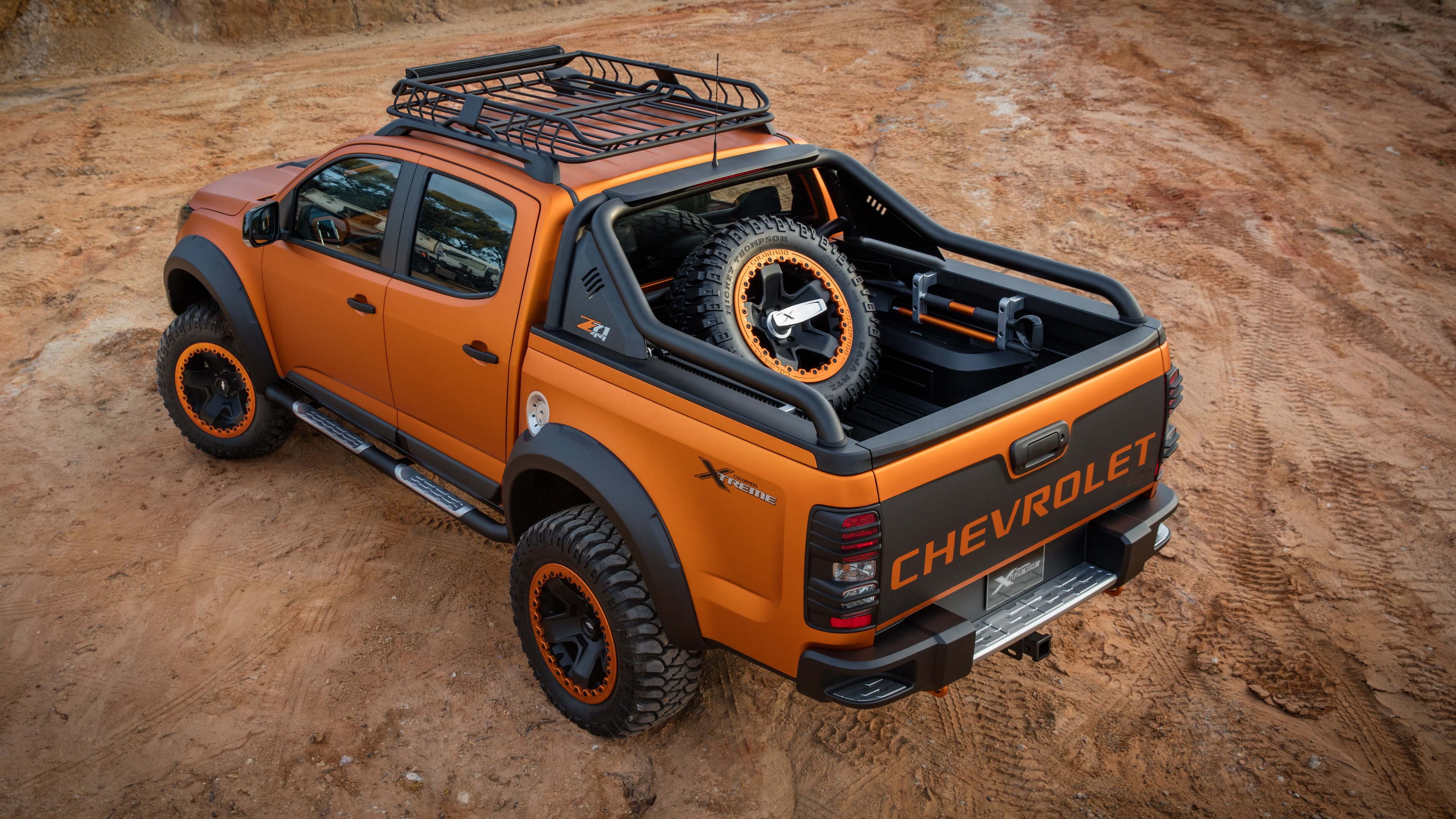 Description: A truck with a cage on the back of it's bed in the dirt with a tire on the back.