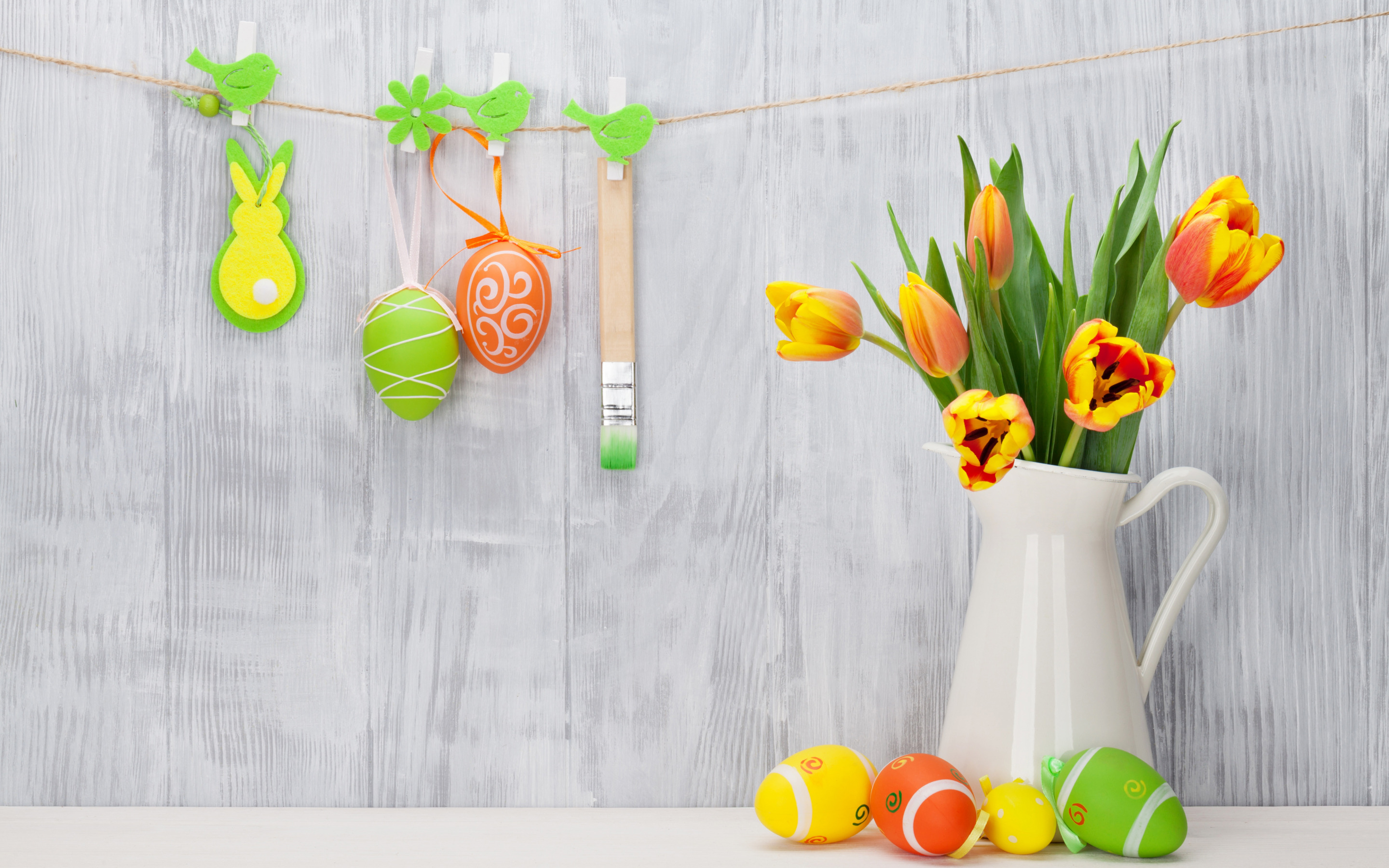 Description: A vase of tulips and other flowers on a table with a string of easter decorations hanging on a clothes line.