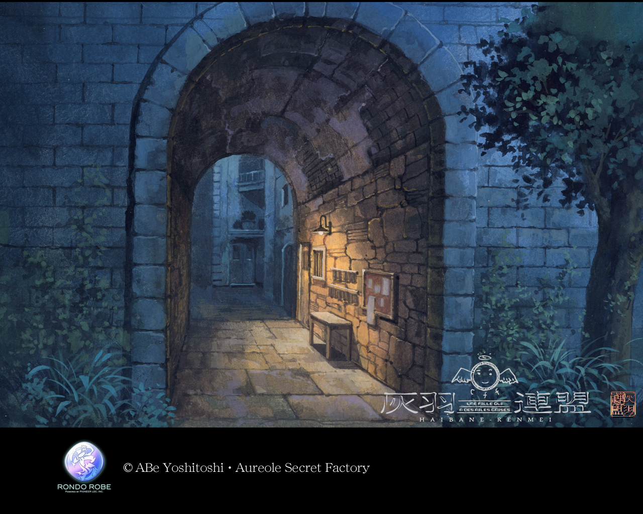 Description: A painting of a tunnel with a bench in it and a light on the door at the end of the tunnel.