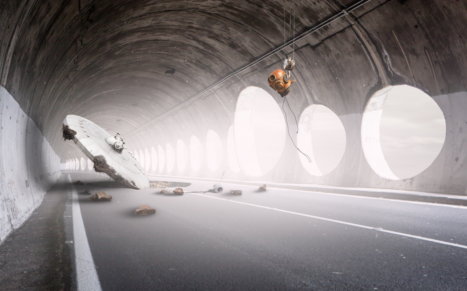 Description: A car that is laying down in a tunnel with a light on it's side and a broken down car in the middle.