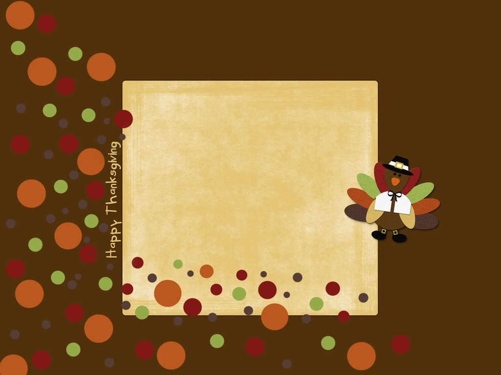 Description: A turkey with a hat and a scarf on a brown background with dots and a large sheet of paper.
