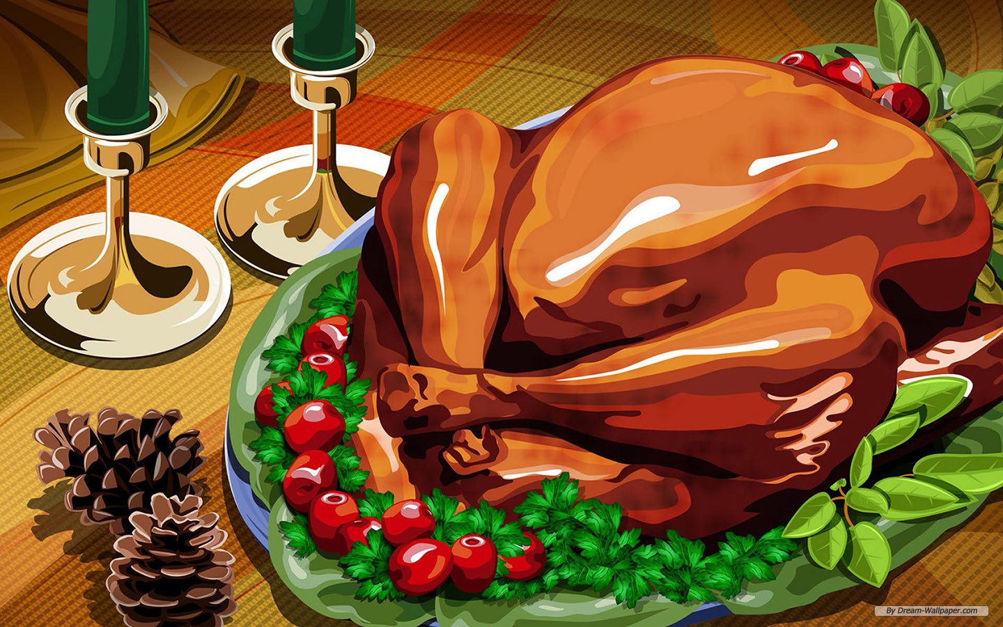 Description: A turkey on a platter with a pine cone and two candles on a table cloth with a pine cone.