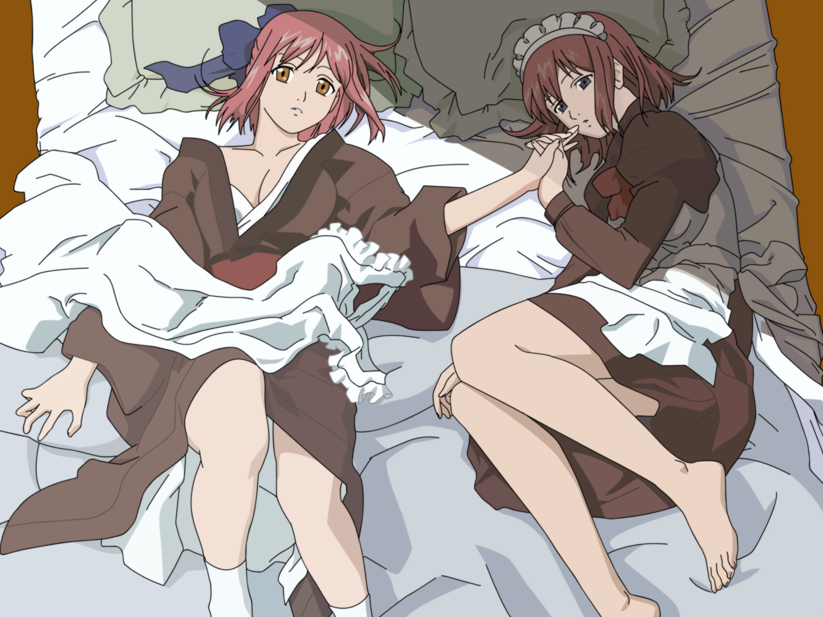 Two anime girls bed pillow free wallpaper for desktop - medium preview image