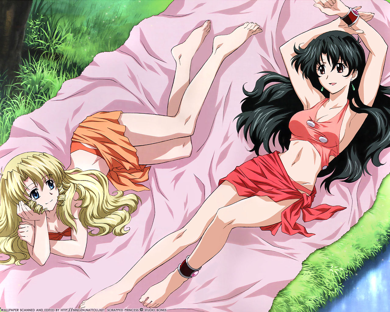 Description: Two anime girls laying on a blanket in the grass with one laying on the ground and the other laying on the ground.