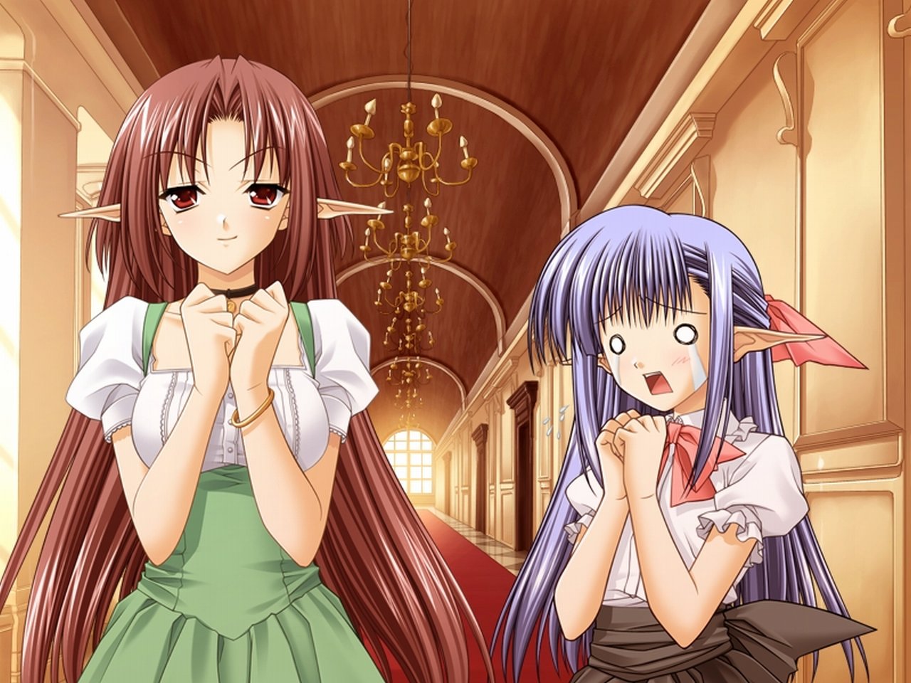 Description: Two anime girls standing in a hallway with long hair and bows on their heads and one girl with long hair wearing a green dress.