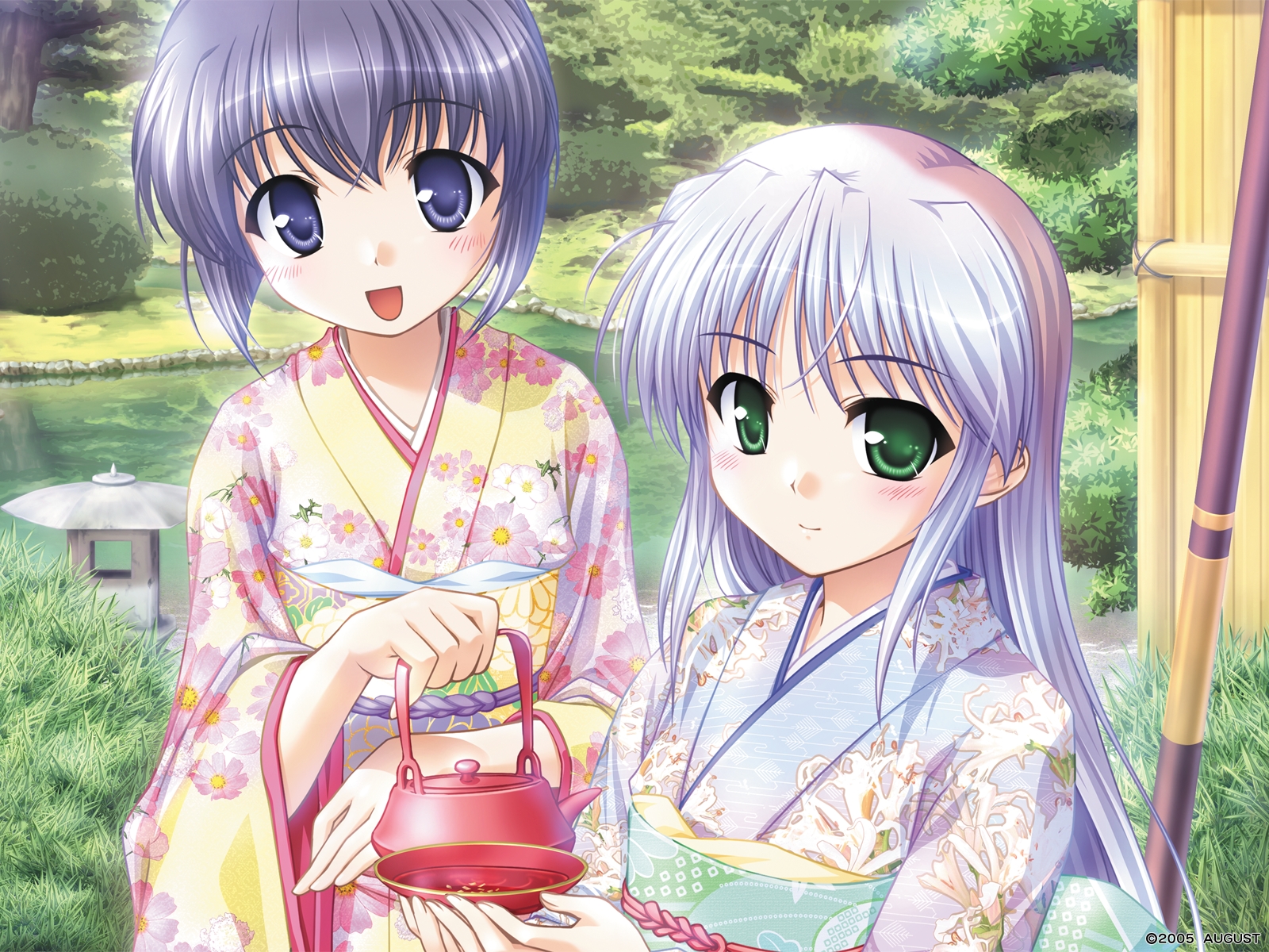 Description: Two anime girls sitting on a bench in a park with a teapot in hand and a teapot in the other hand.