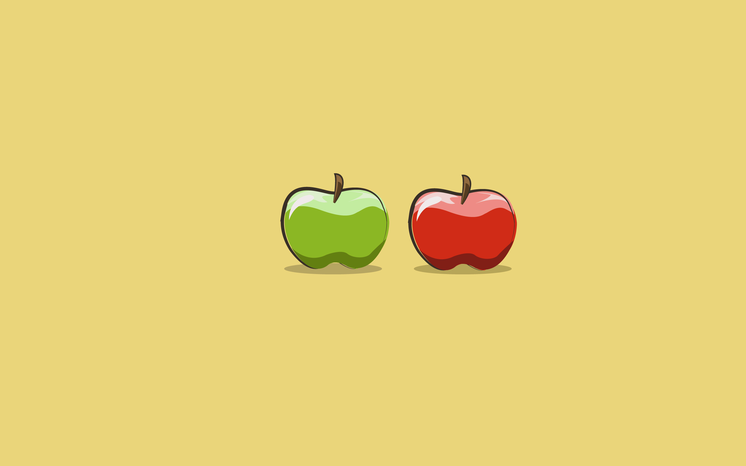 Description: Two apples sitting side by side on a yellow background with a yellow background and a red apple in the middle.