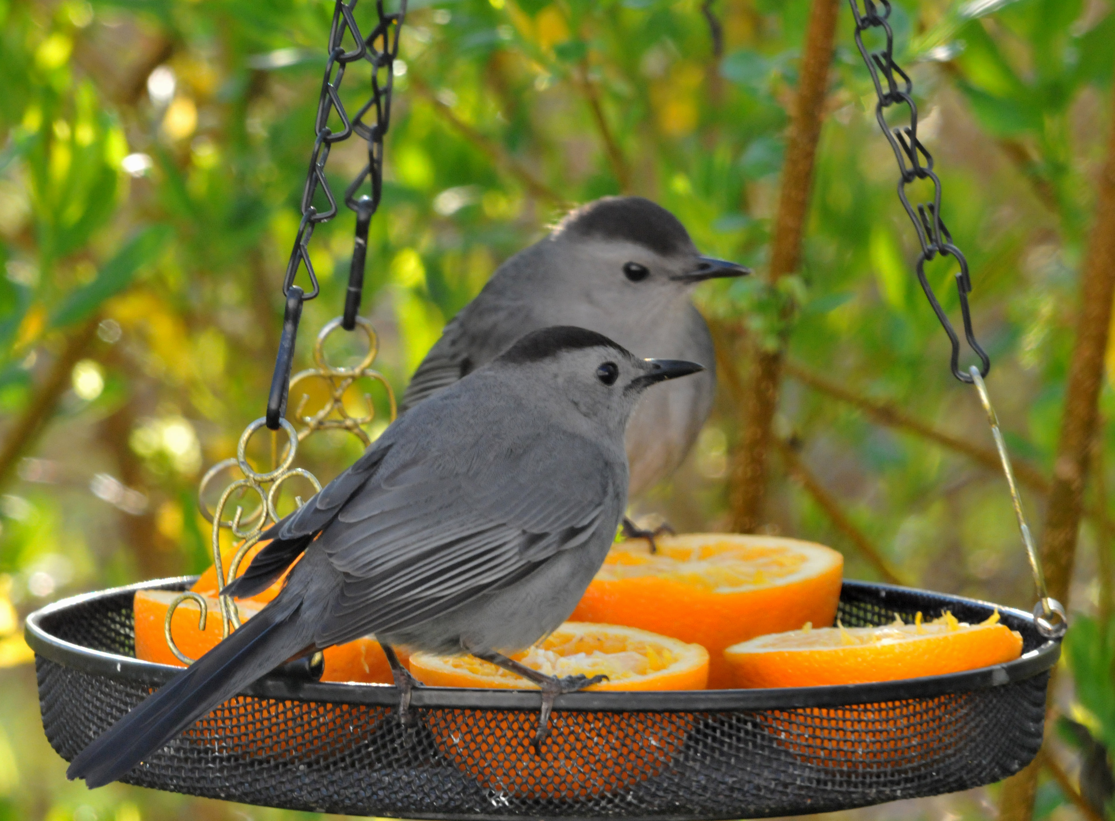 Description: Two birds are sitting on a bird feeder with oranges in it and one bird is eating from the oranges.