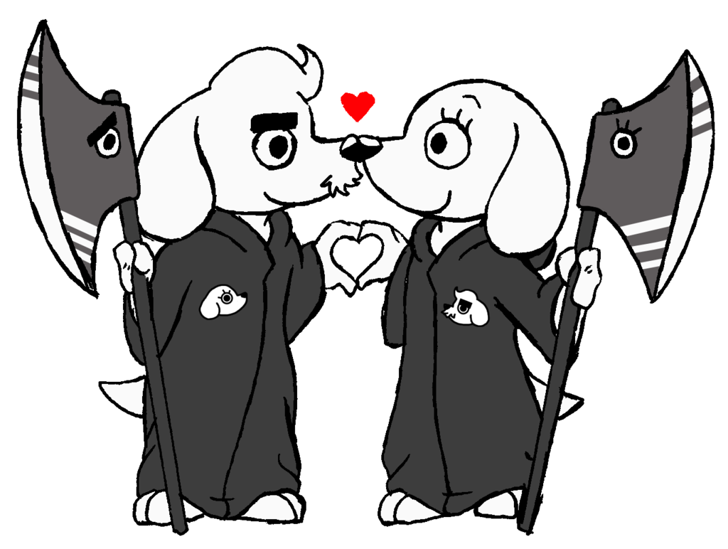 Description: Two dogs in robes with flags and a heart on their heads.