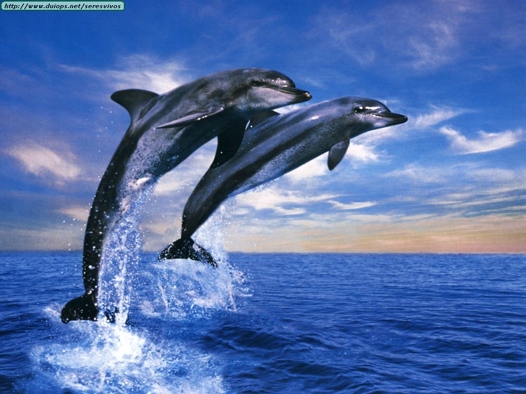Description: Two dolphins jumping out of the water at sunset or dawn or dawn or dawn or dawn or dawn or dawn.